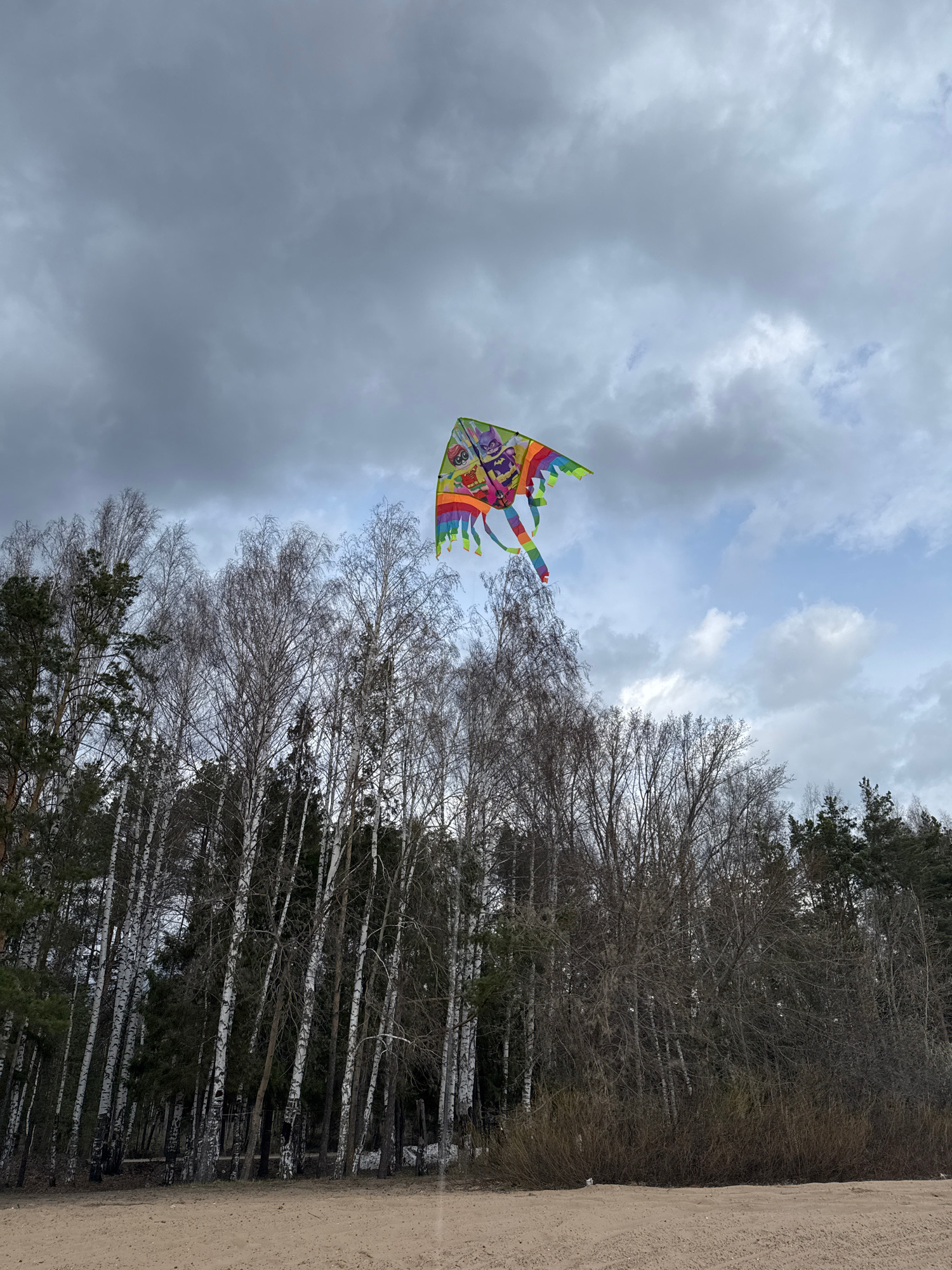A kite flies in the sky near a forest. The kite has multiple colors, including green, yellow, orange, and blue. Some trees are deciduous with white bark, while others are evergreen with dark green neeβ¦read more