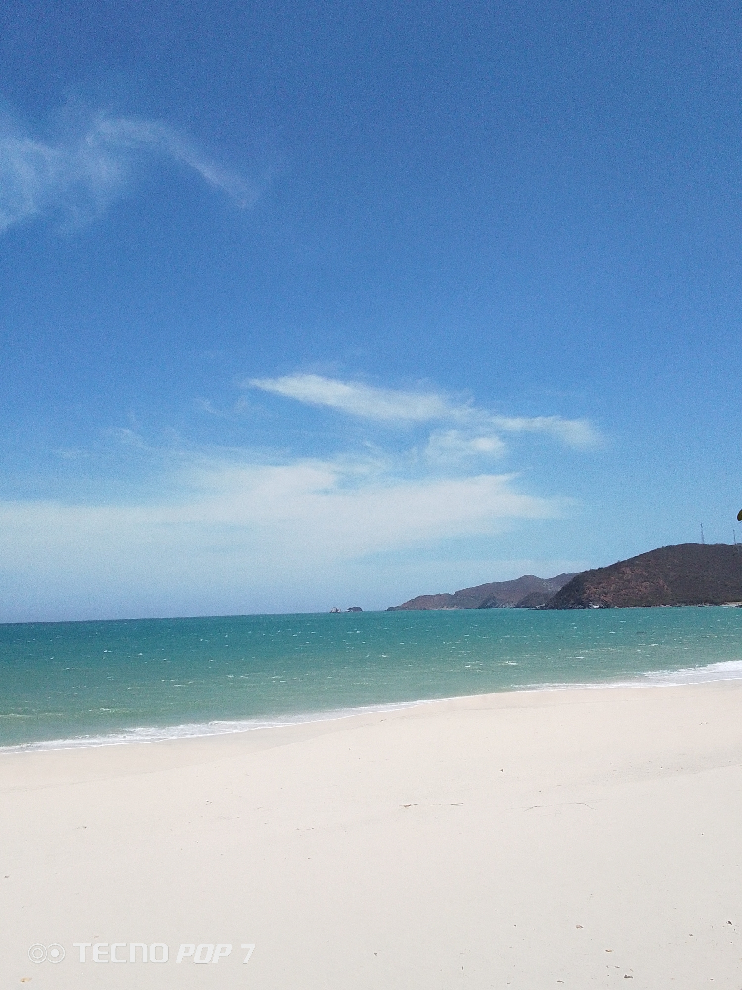 The image shows a beach scene in Pedro González, Venezuela, under a clear blue sky with sparse white clouds. The ocean has a turquoise hue with visible waves. A wide stretch of white sand comprises th…read more
