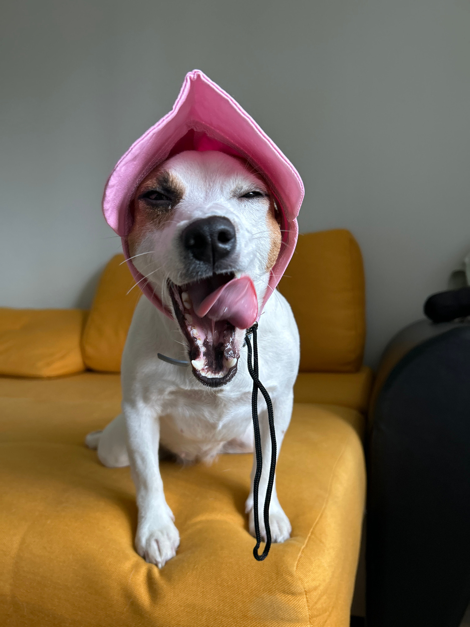 A white and tan Jack Russell Terrier dog lies upside down on a yellow couch, wearing a pink hat. The dog's mouth is open, and its tongue is sticking out. A black string is draped near its face. The do…read more