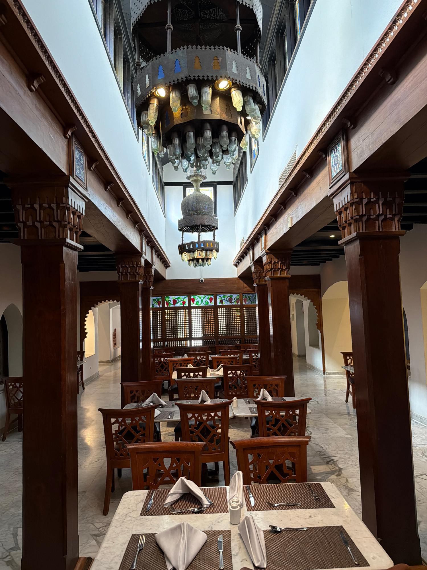The image depicts the interior of a restaurant in Sharm El Sheikh, Egypt. Rows of dark wood chairs are aligned along tables set with placemats, silverware, and folded napkins. Ornate, dark wood beams…read more