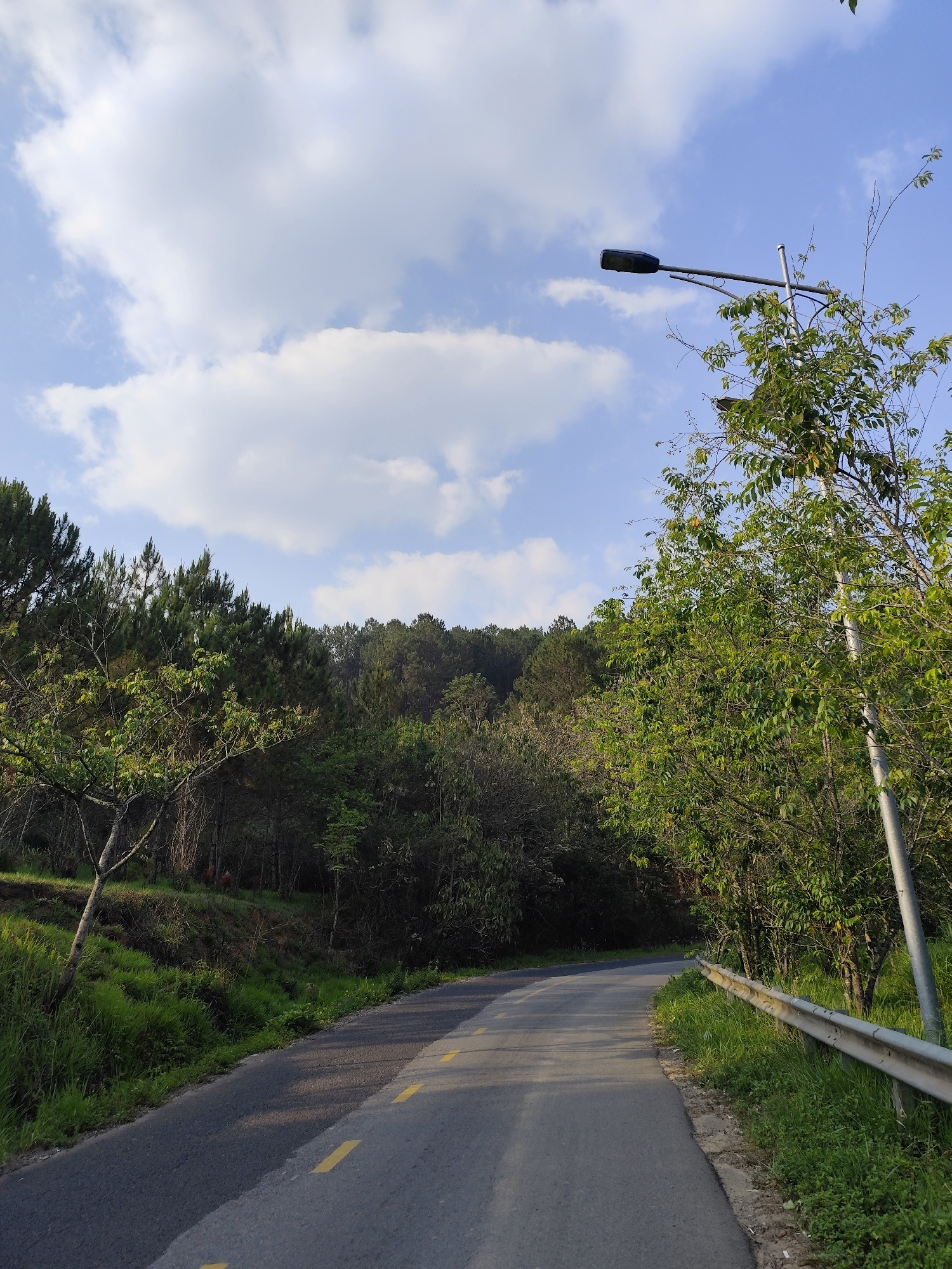 A curving road winds through a forested area in Da Lat, Vietnam. The road is divided into two lanes with a yellow dashed line separating them. A guardrail runs along the right side of the road. A streβ¦read more