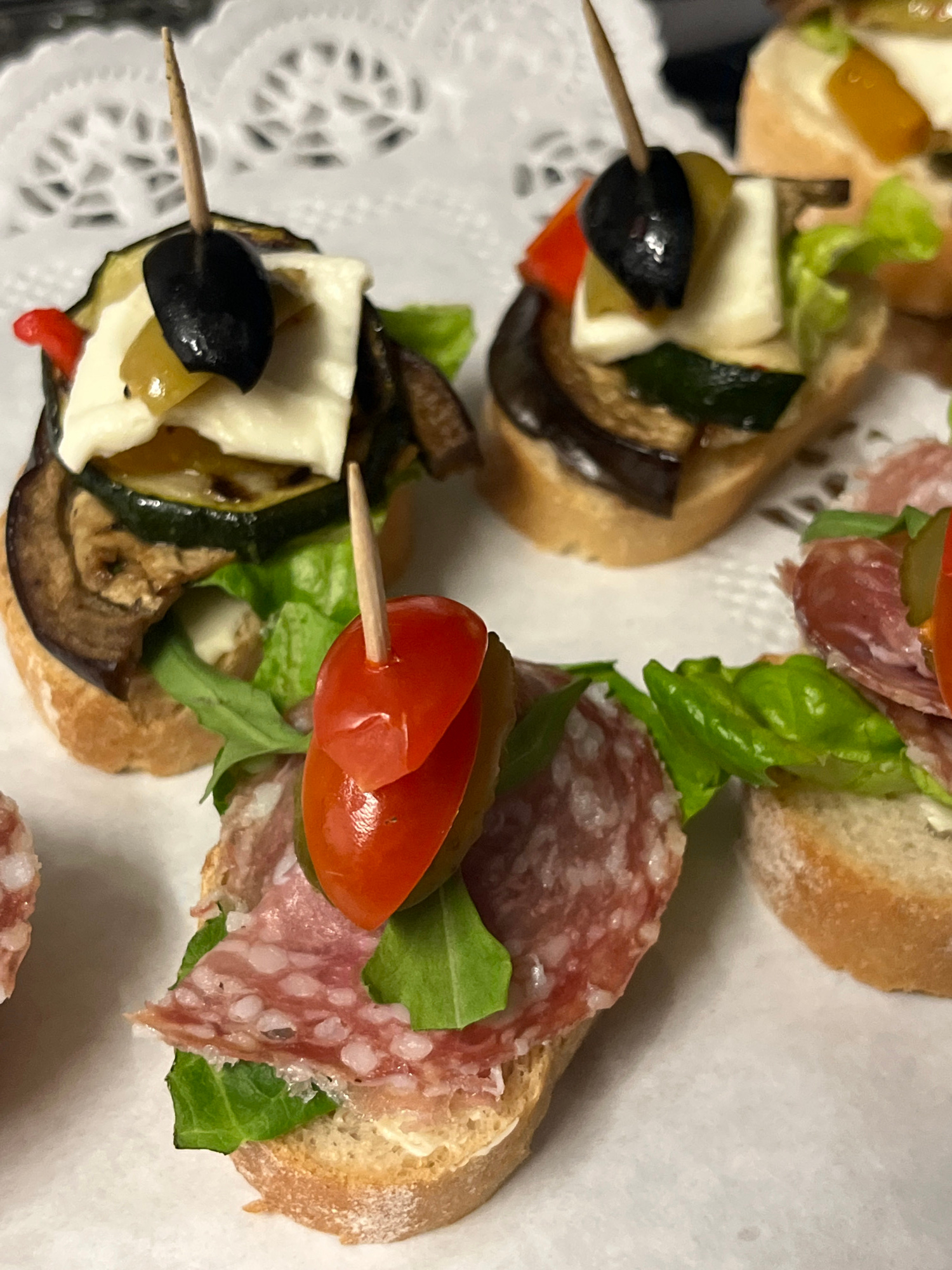 The image shows a close-up of several appetizers arranged on a white, doily-like surface. The appetizers appear to be small slices of bread topped with various ingredients. Some appetizers are topped…read more