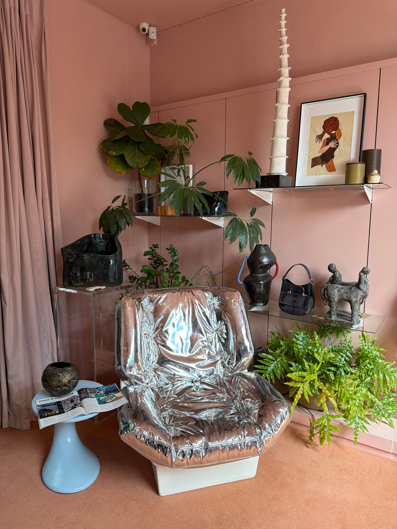 The image shows an interior with a pink wall and carpet. A clear glass shelf system displays various objects, including a framed artwork, ceramic pieces, a handbag, plants, and sculptures. A silver, i…read more