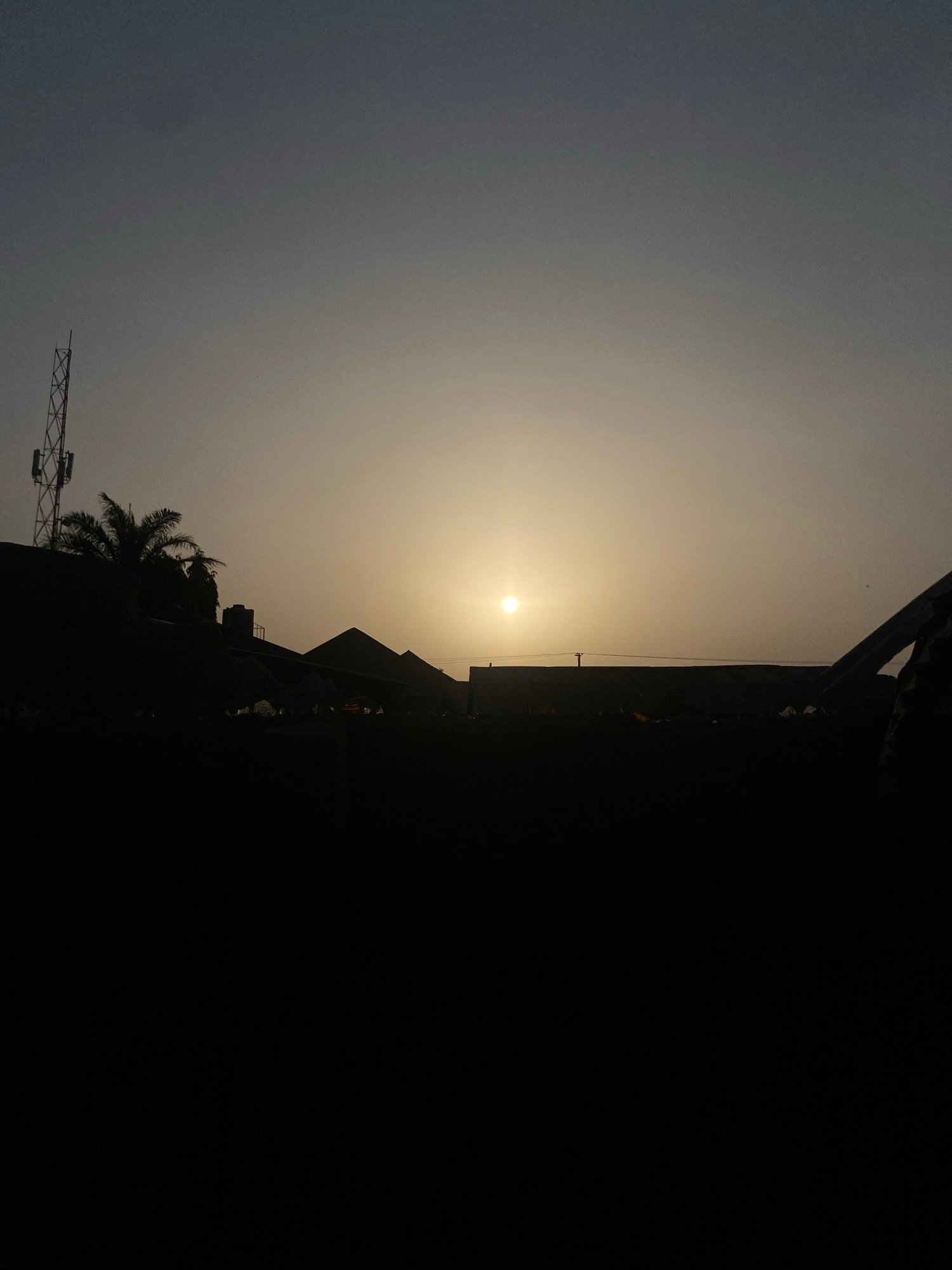 The image shows a hazy sky with the sun centered. To the right, the silhouetted outline of buildings and structures is visible. In the lower left, the silhouetted outline of a crane and a palm tree ca…read more