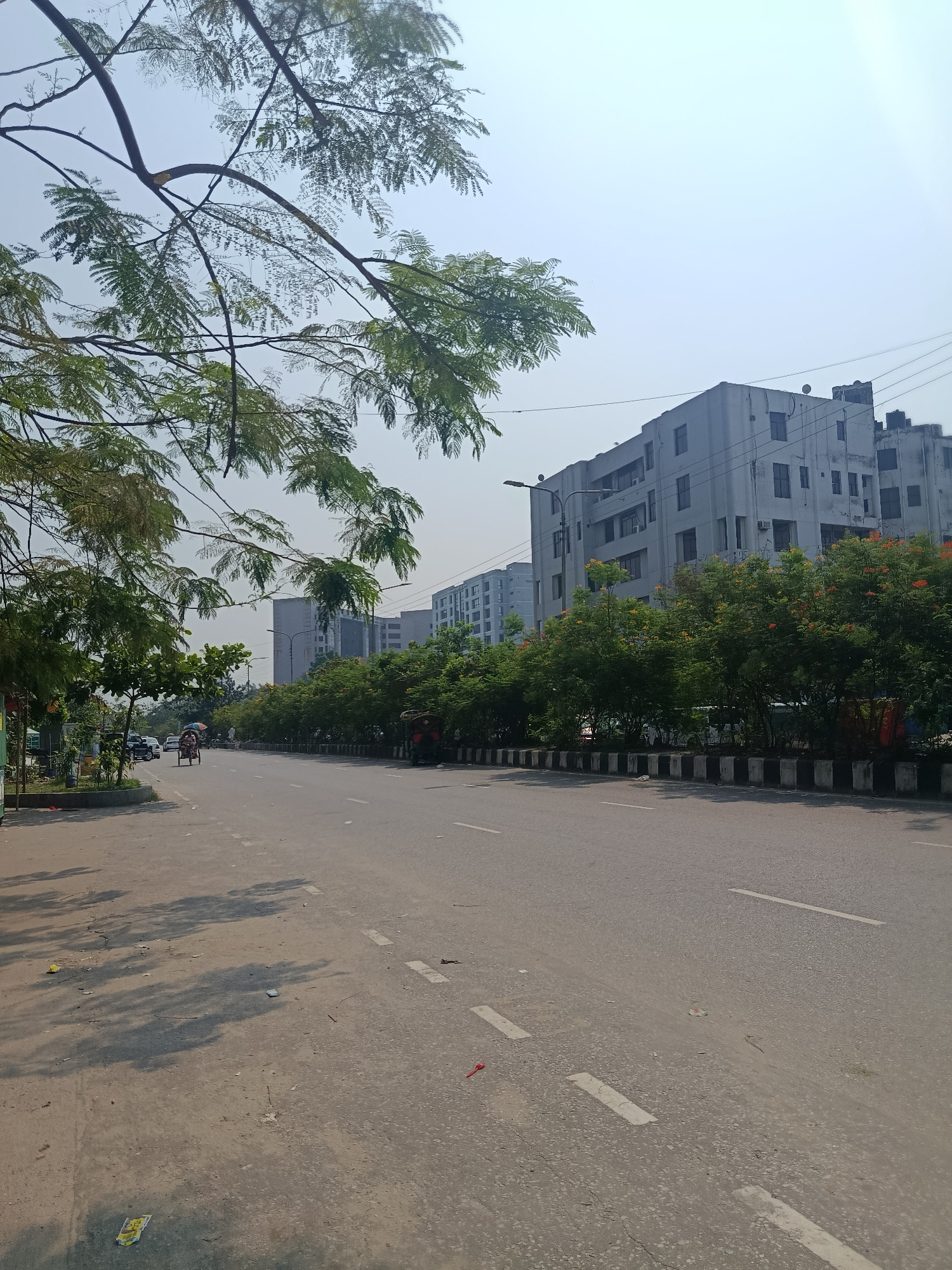 The image shows a straight, wide road in Dhaka, Bangladesh. The road has white dashed lane markings and a median with trees and a black-and-white striped curb. Several grey buildings are in the backgr…read more