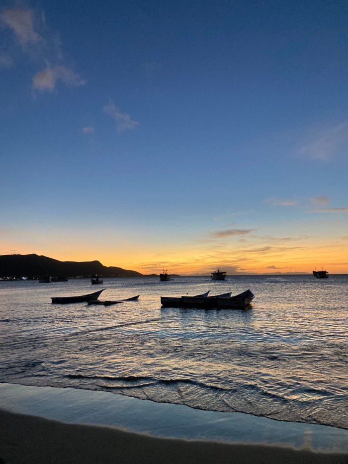 A tranquil scene unfolds with a gradient sky of blue merging into orange, hinting at either sunrise or sunset. The ocean mirrors the sky's hues, reflecting ripples and waves gently caressing the shore…read more