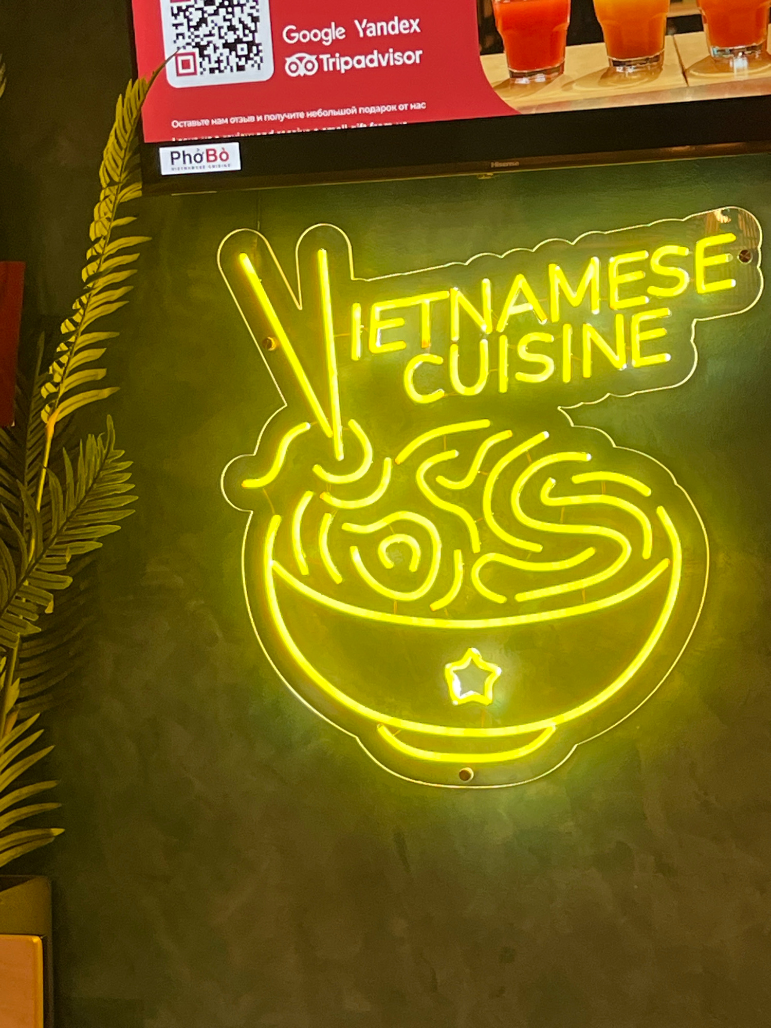 The image depicts a vertical close-up shot of a wall-mounted neon sign for a Vietnamese restaurant, taken indoors. The neon sign features yellow lights spelling out "Vietnamese Cuisine" vertically, ac…read more