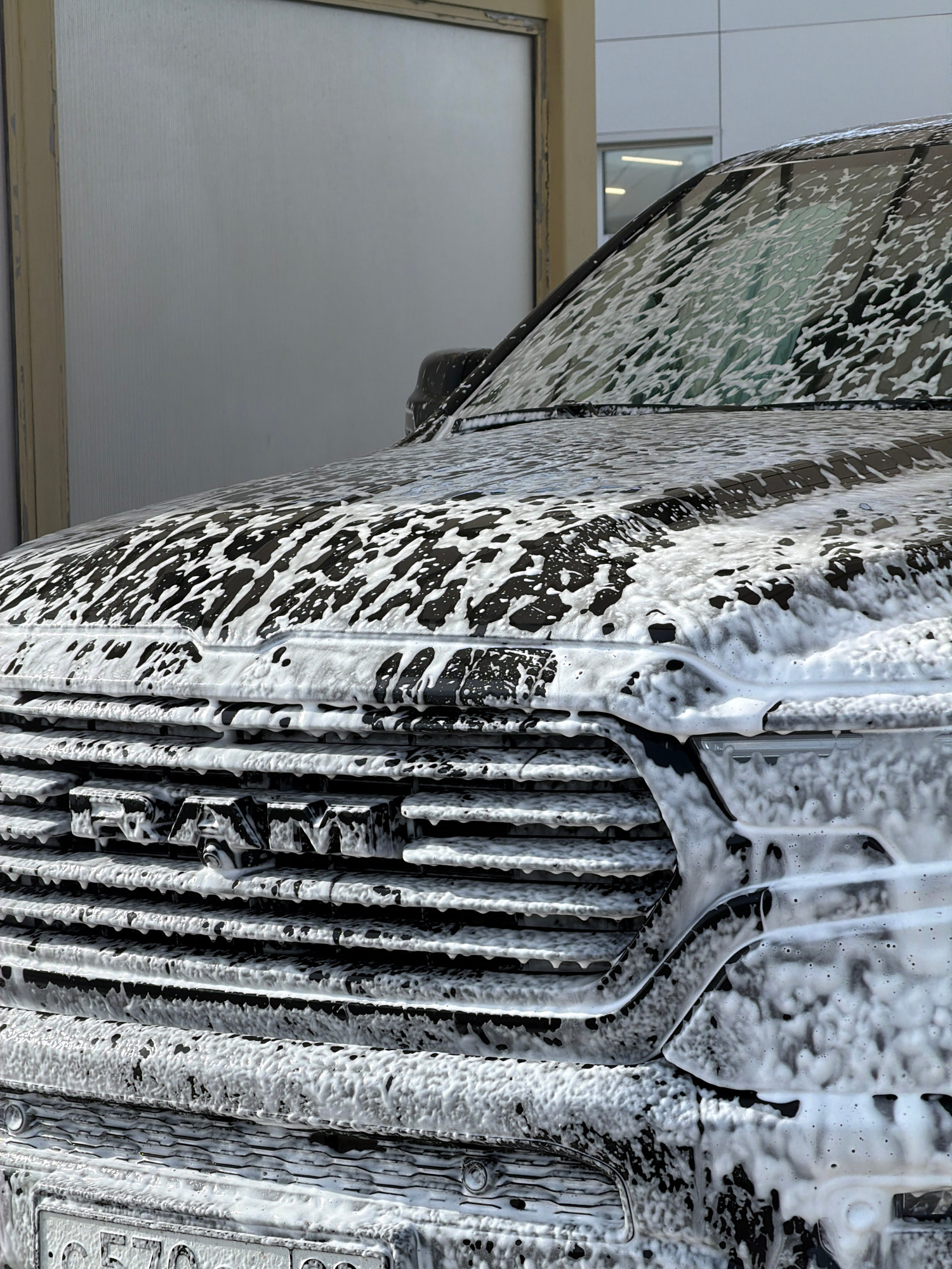 The image presents a close-up, low-angle perspective of a dark-colored vehicle, likely a Land Rover Defender, being thoroughly washed at what appears to be an indoor or covered car wash facility. The…read more