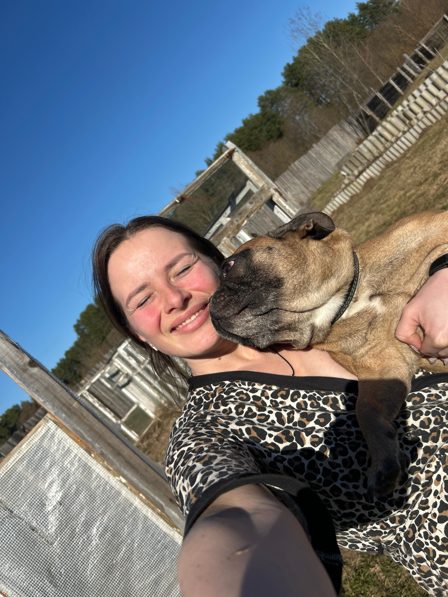 A person is holding a tan and black dog in their arms, posing for a selfie. The person has dark hair and is smiling with their eyes closed. They are wearing a leopard-print top. The dog has a black co…read more