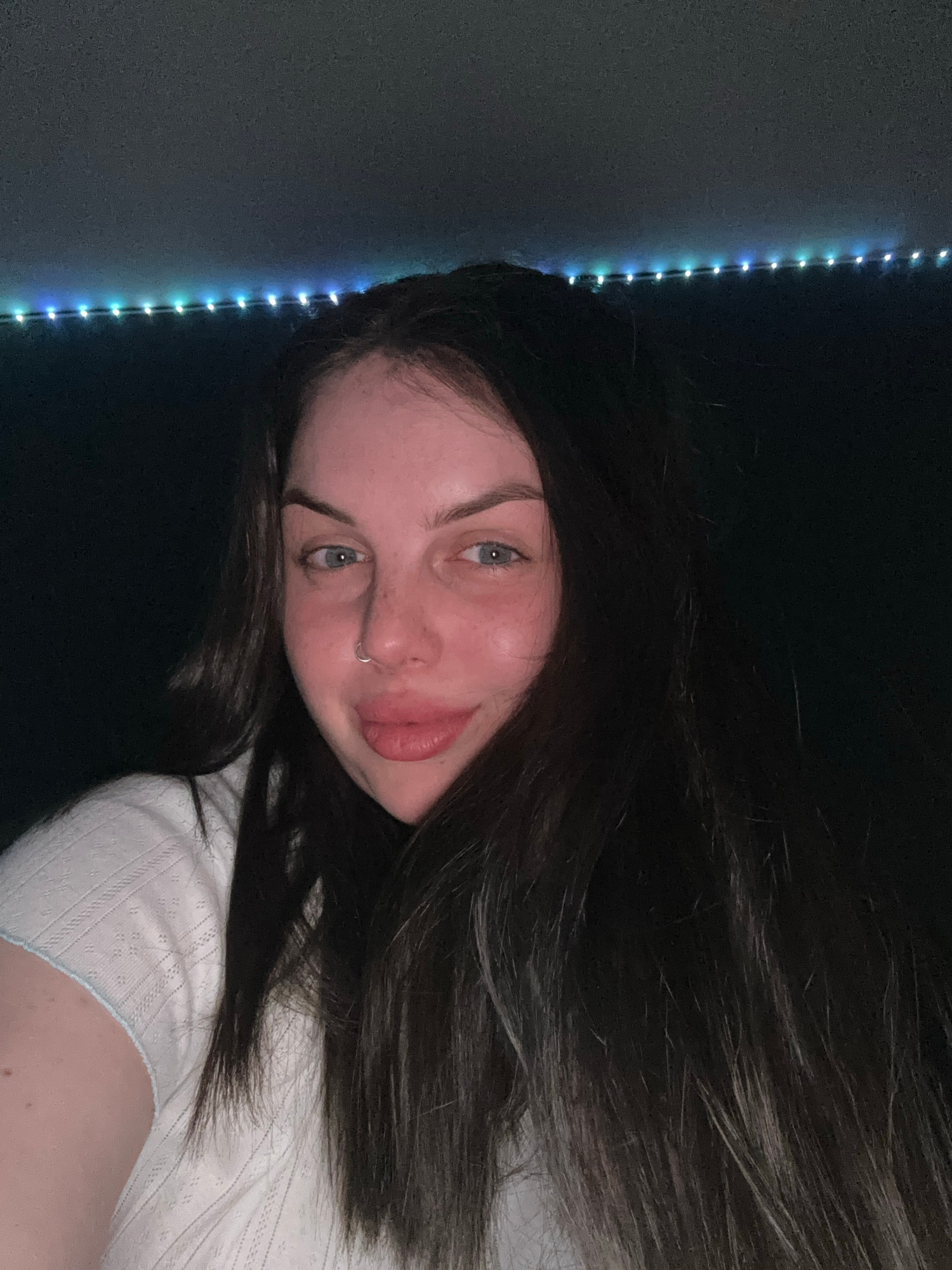 A young woman with light skin, blue eyes, and dark brown hair is lying down, facing the camera. She has a silver ring in her left nostril. She is wearing a white top. Behind her is a dark wall, and to…read more