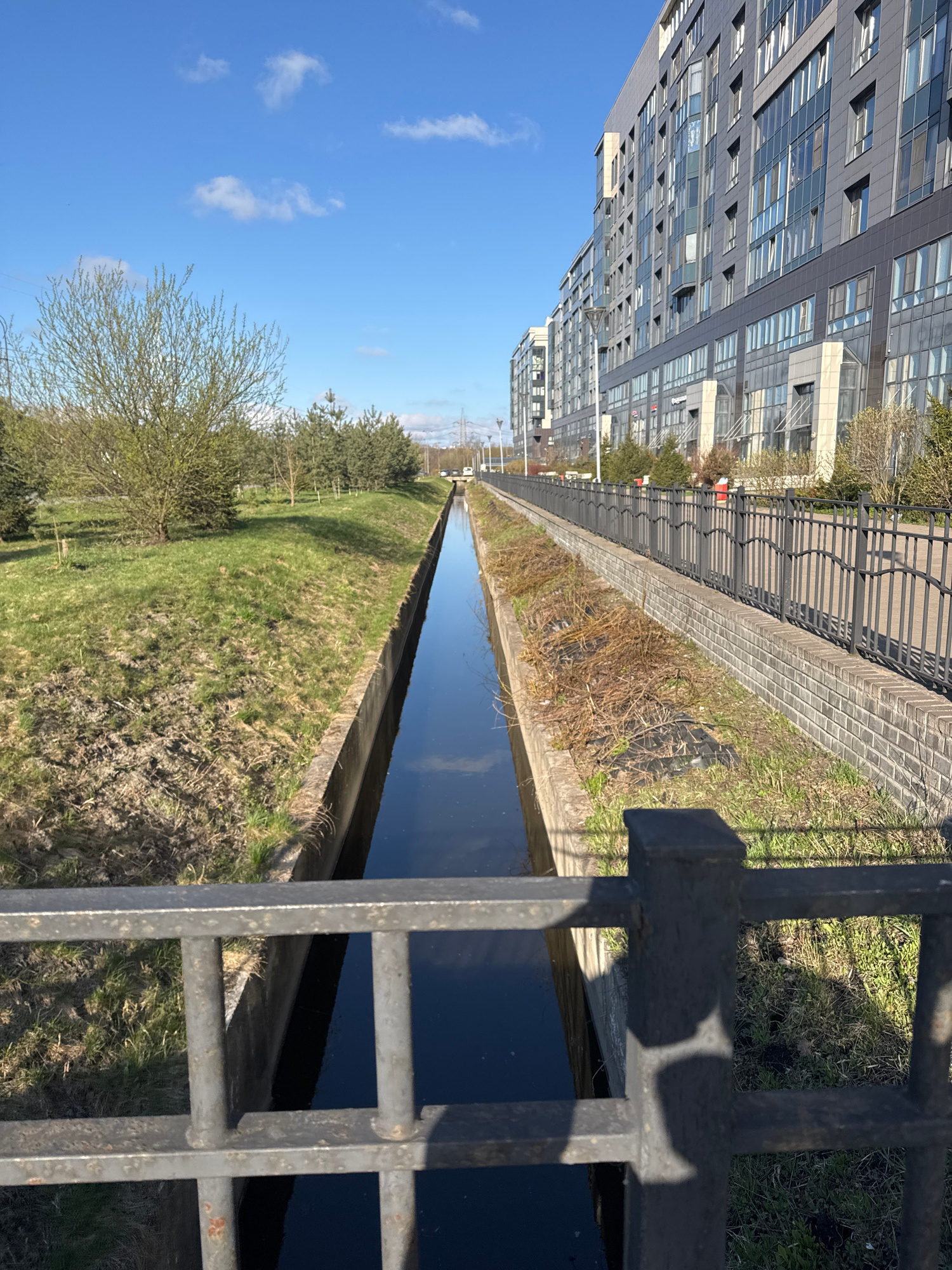 The image shows a narrow canal lined by concrete walls, filled with dark water reflecting the sky. On the left bank, there is green grassy terrain with trees and foliage. On the right bank, a modern b…read more