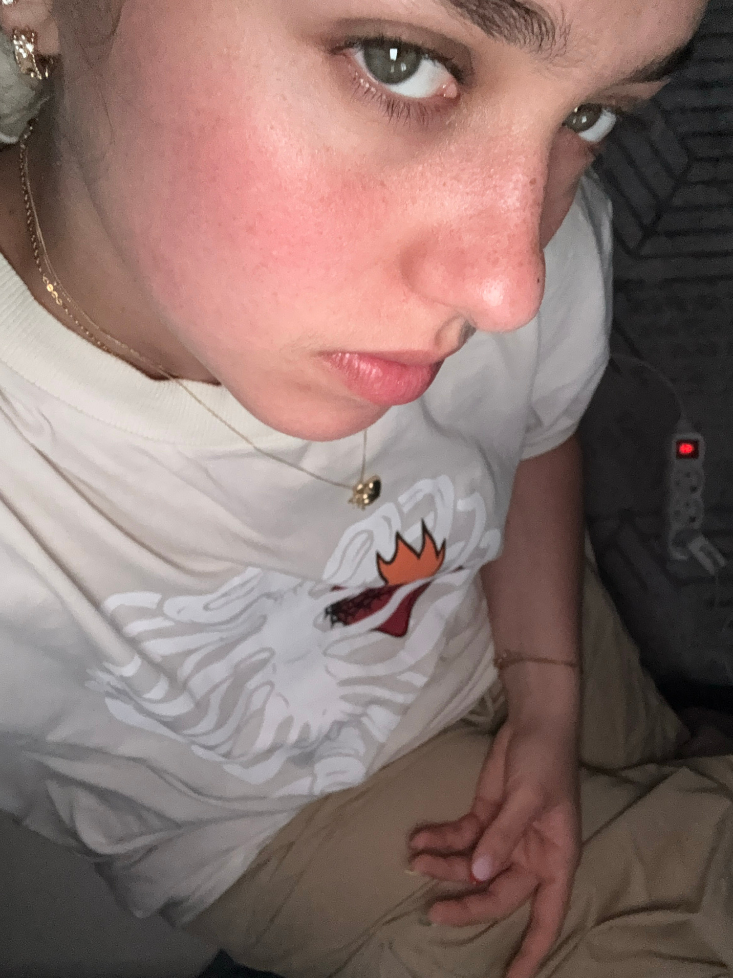 A selfie-style close-up photograph shows a person lying on a bed or couch with a patterned shirt. The person has fair skin, green eyes, and light-colored hair. They wear a gold necklace and a gold bra…read more