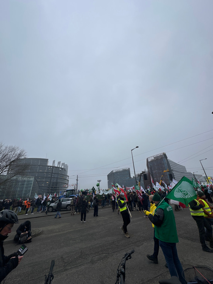 The image captures a wide-angle view of a large-scale demonstration occurring on a paved street in Strasbourg, France, under an overcast grey sky. In the background to the left, the distinct, modern g…read more