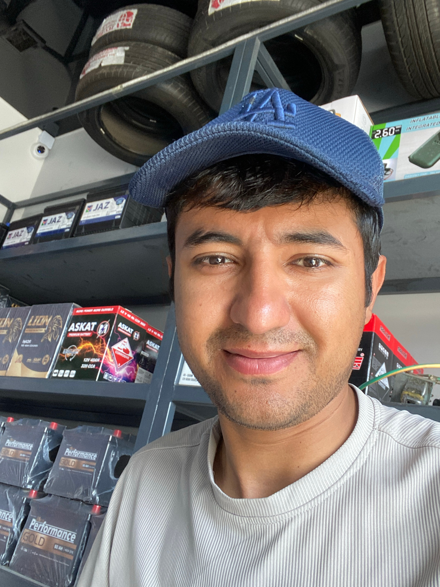 The image shows a man with dark hair and eyes, wearing a blue cap and a light-colored striped shirt. He is smiling slightly. Behind him, shelves are stocked with various items including tires, car bat…read more