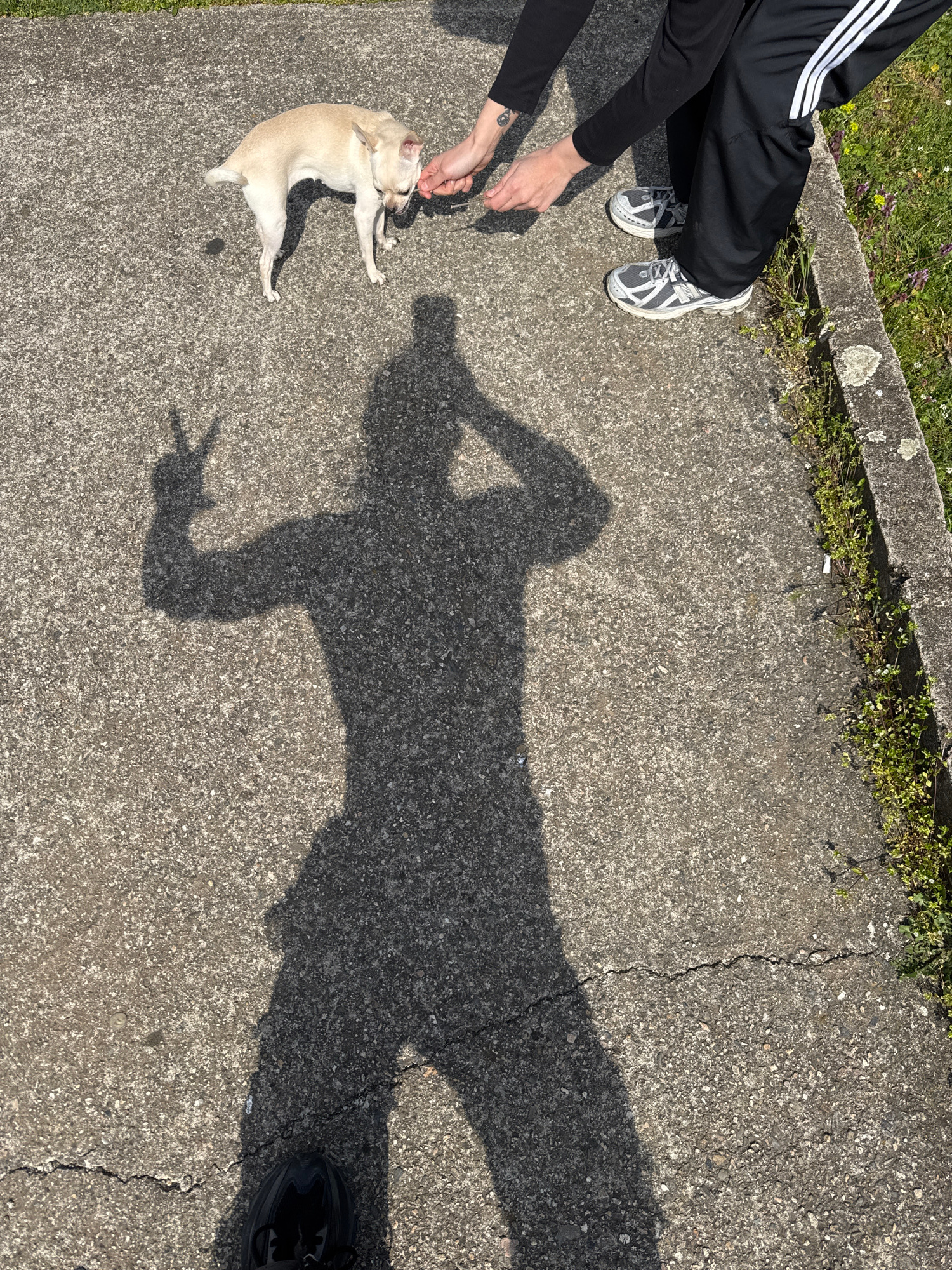 A sunlit outdoor scene on a concrete surface. In the upper left corner, part of a person's legs wearing black athletic pants with white stripes and grey sneakers are visible. Adjacent to them, another…read more