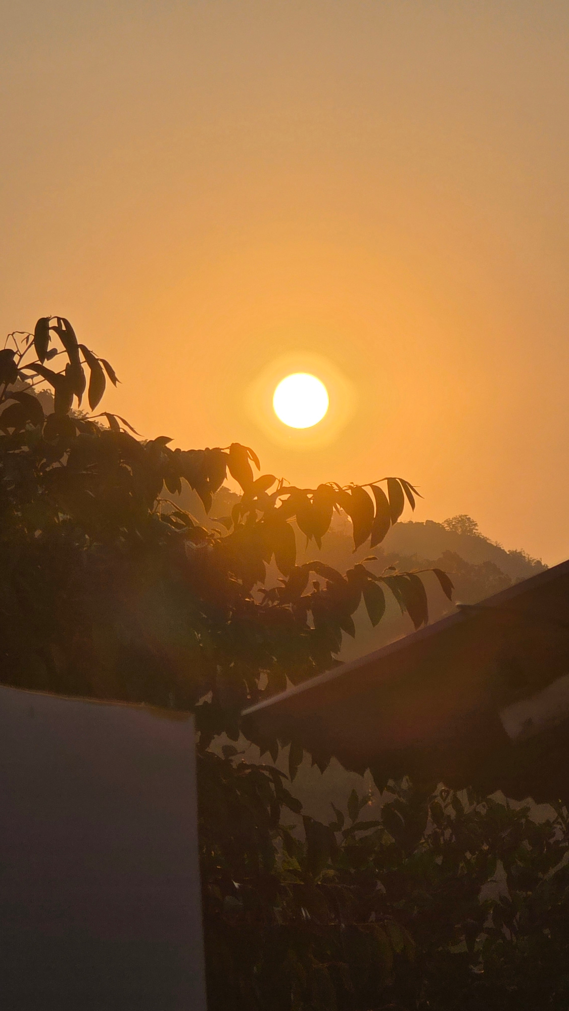 The image depicts a sun in an orange sky with hazy conditions, possibly sunrise or sunset. A tree with dark leaves is positioned on the right side of the image, partially obscuring a structure with wh…read more