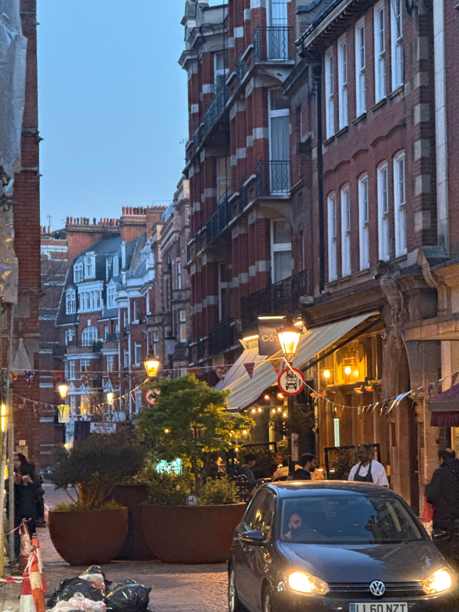 The image depicts a street scene in London, United Kingdom. A dark-colored car is positioned on the right side of the frame, with its headlights illuminated. A man is visible in the driver's seat. On…read more