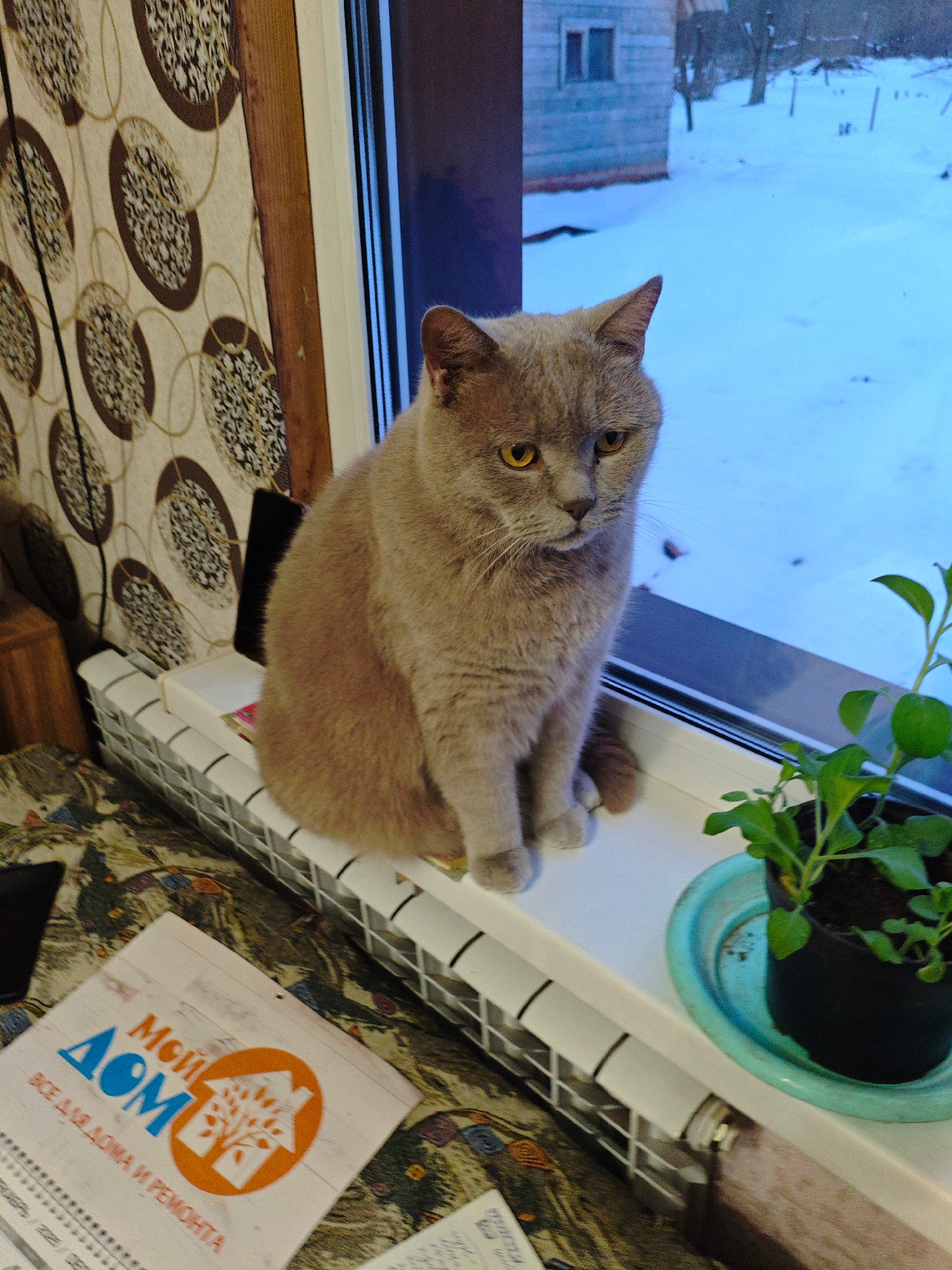 A medium-sized, shorthaired, grey cat with yellow eyes sits on a white radiator beneath a window. Outside, a snow-covered landscape is visible, including a small building and a few trees. Next to the…read more