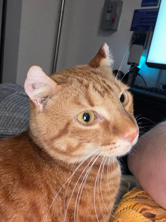 A close-up image features an orange tabby cat looking upward with wide, attentive eyes. Its fur is a mix of orange and darker stripes. Long white whiskers extend from its face. Part of the cat's ear i…read more