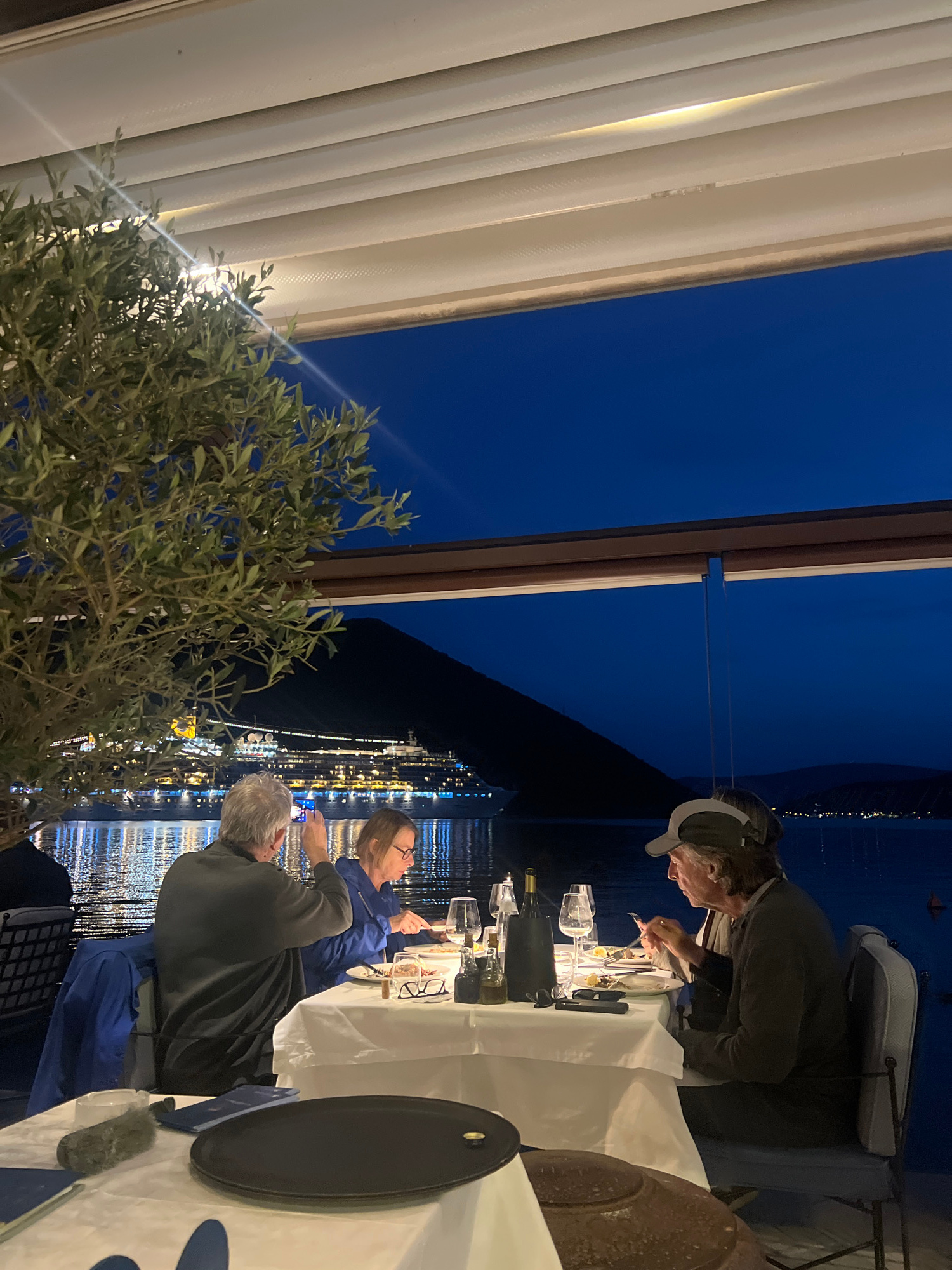 Three people are seated at a white-clothed table with dinnerware on it, including bottles, glasses, and plates. The people are interacting, seemingly enjoying a meal. One person has a sun visor on. Th…read more