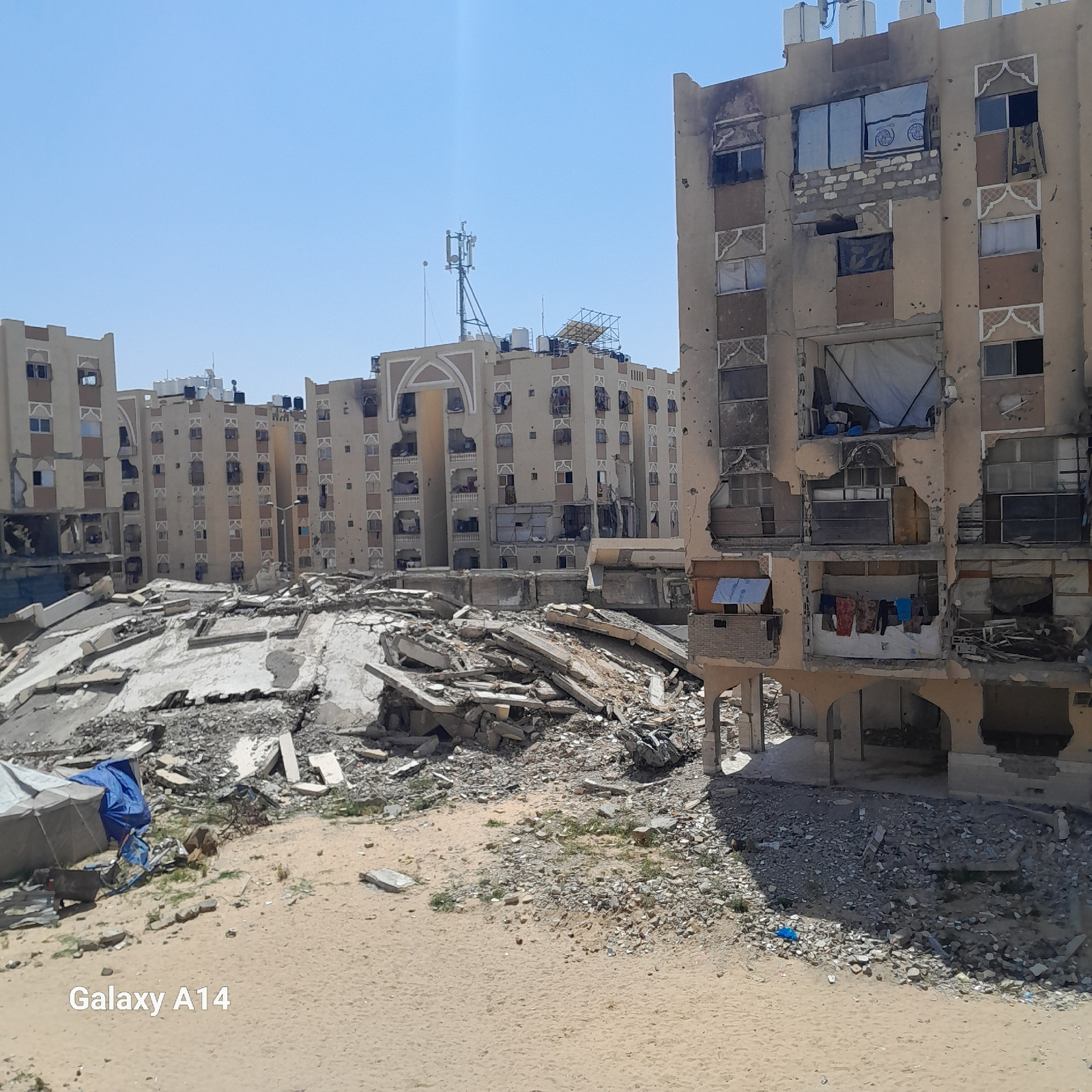 The image depicts extensive destruction in what is likely a residential area in Khan Yunis, Palestinian Territory. Several multi-story buildings show significant damage, ranging from shattered windows…read more