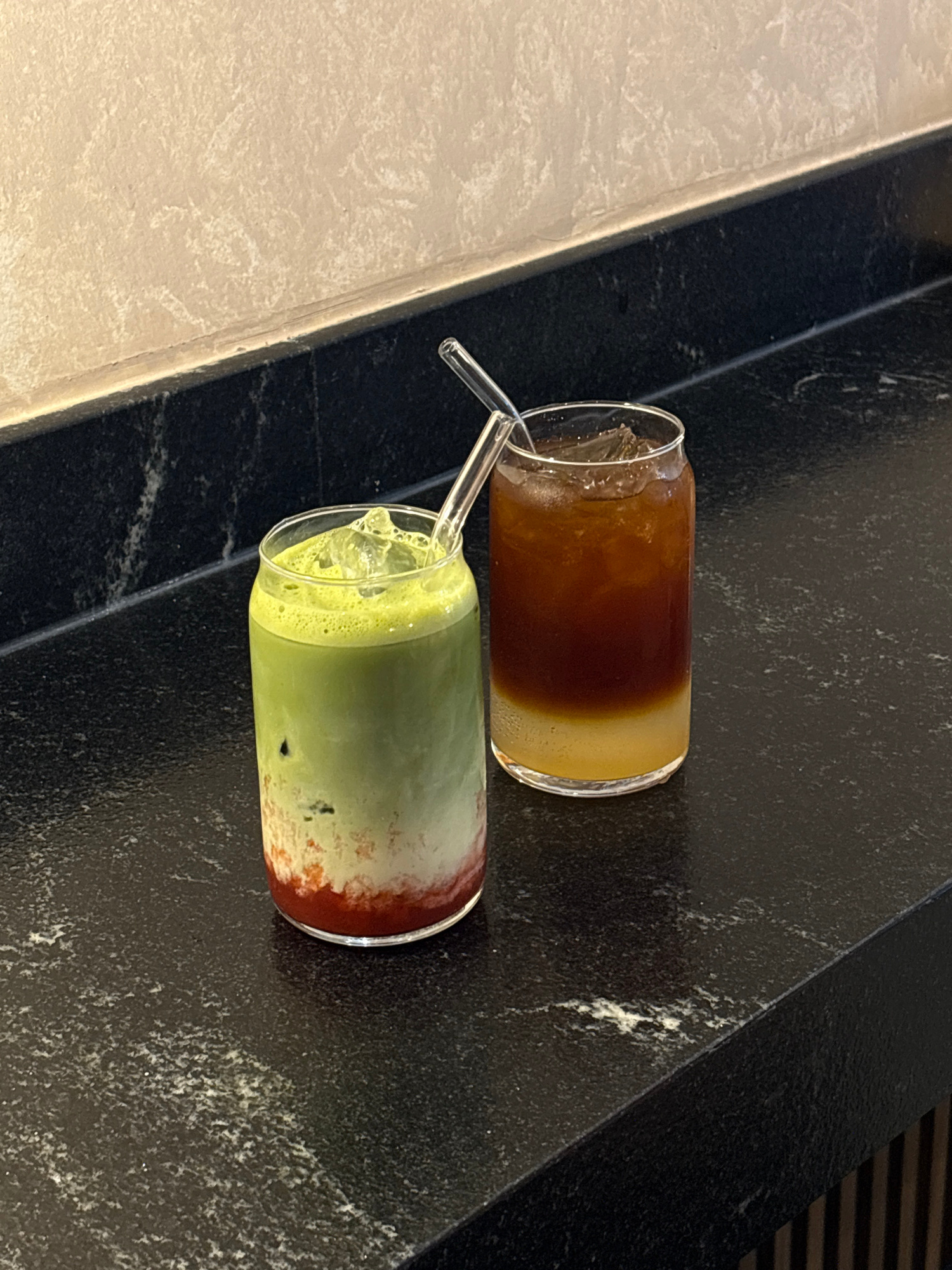 Two drinks in glass cans, each with a bent glass straw, are placed on a dark, textured countertop. One drink is layered brown and yellow, while the other is layered green, yellow, and red, with ice vi…read more