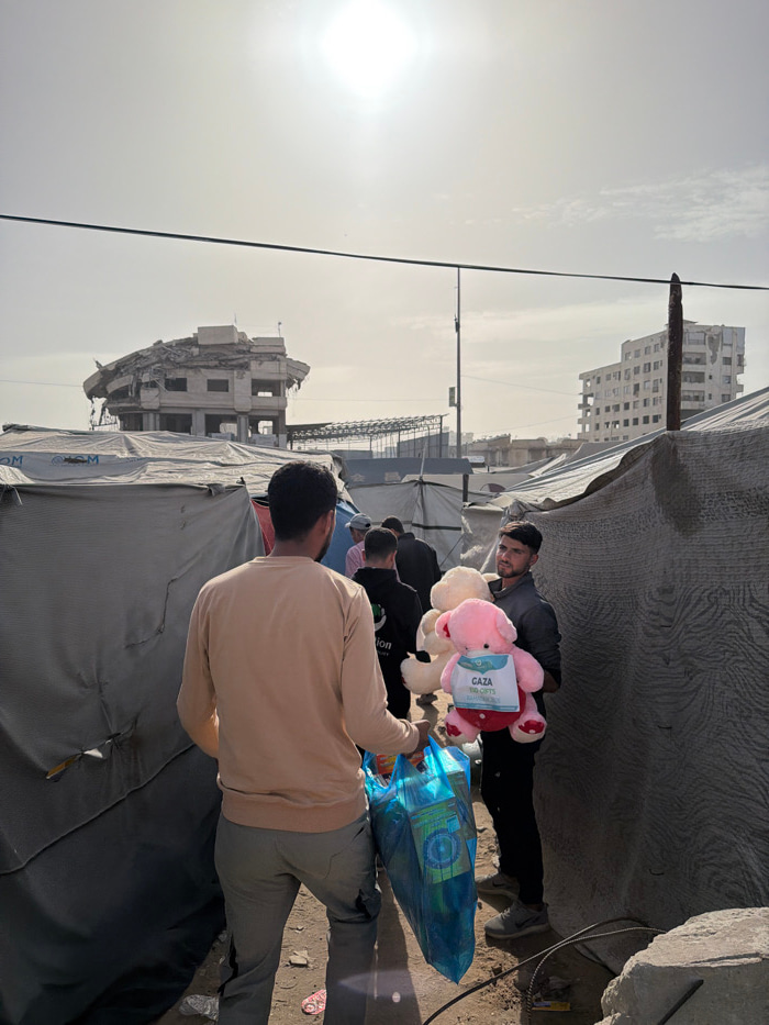 People are standing outside near tents holding gifts, including teddy bears and blue gift bags. Debris and destroyed buildings are visible in the background, indicative of a recent disaster or conflicβ¦read more