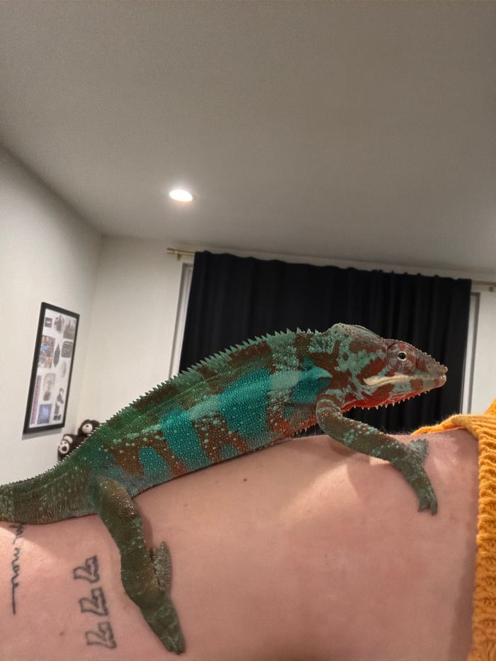 A chameleon clings to a person's shoulder, its vibrant turquoise and red scales contrasting against the skin. The person wears a mustard-yellow knit top. The chameleon's feet grip tightly. In the back…read more