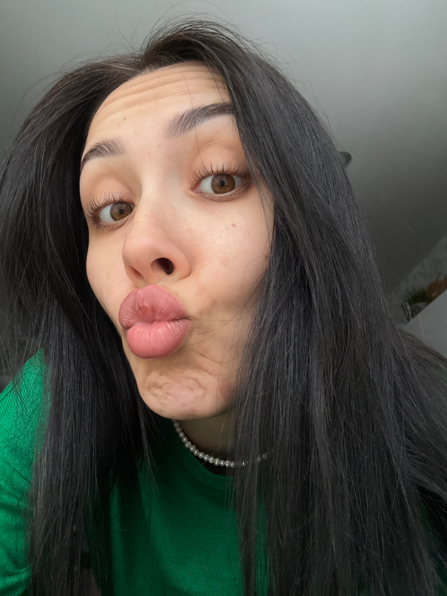 A woman is depicted in a selfie-style, angled shot. She has long, dark hair and brown eyes. She is wearing a green top and a pearl necklace. Her lips are pursed. The background is a blurred neutral to…read more