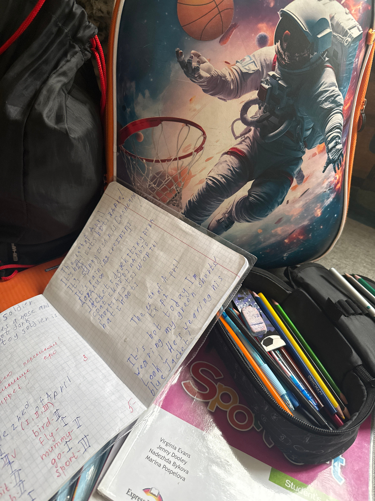 The image captures a close-up, top-down view of various school supplies, indicative of a student's workspace in Dmitrov, Russia. The primary subject on the left is a vibrant school backpack or bag fe…read more