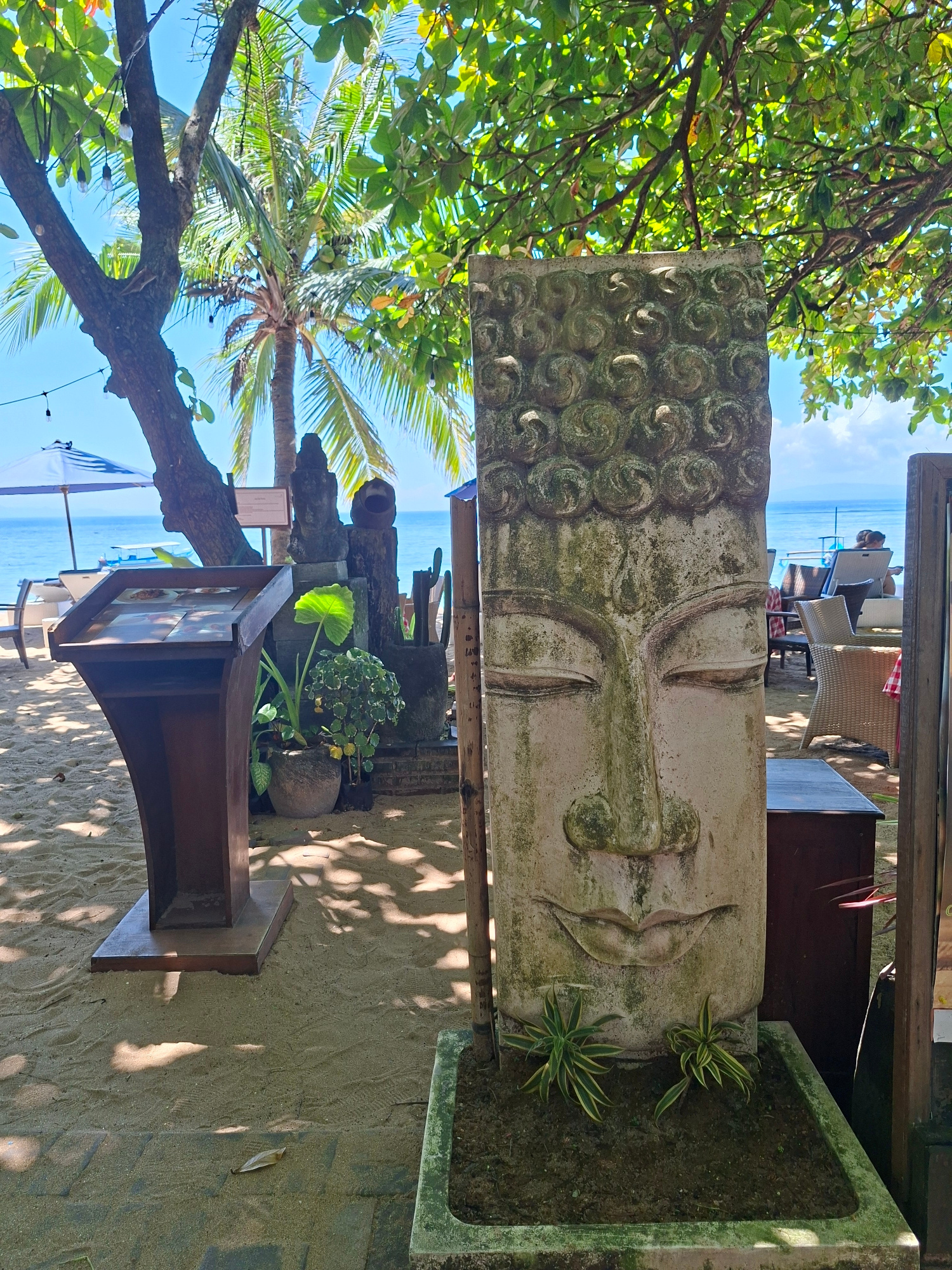 The image, taken from a low angle, shows a tropical beach scene. A stone sculpture of a Buddha's head is prominently featured in the center of the frame, with greenery growing out of its top and side.…read more