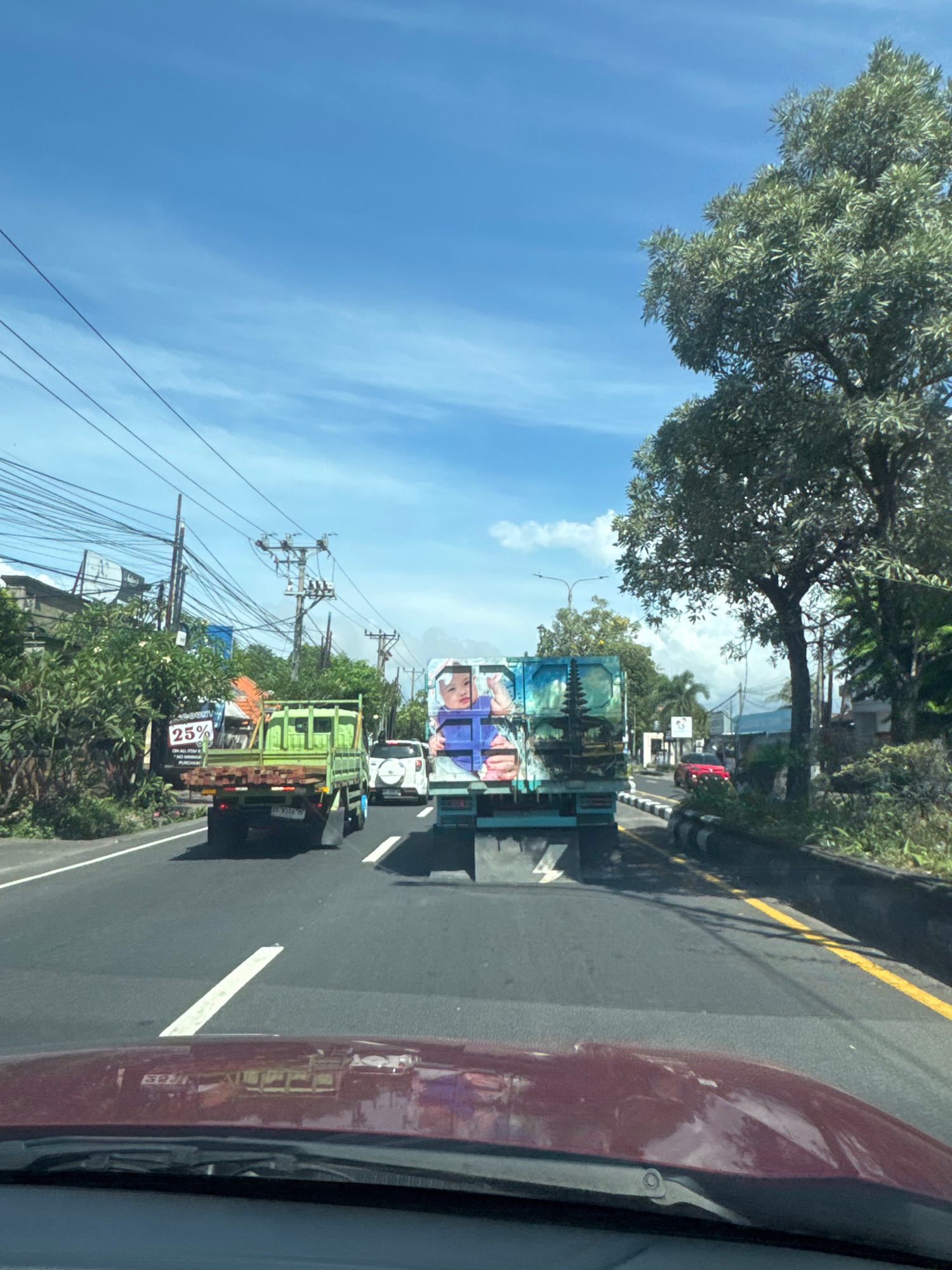 Captured from within a vehicle, the image portrays a street in Denpasar, Indonesia. A dual-lane road with a yellow shoulder stripe is visible, occupied by a line of trucks. The first truck is green wi…read more