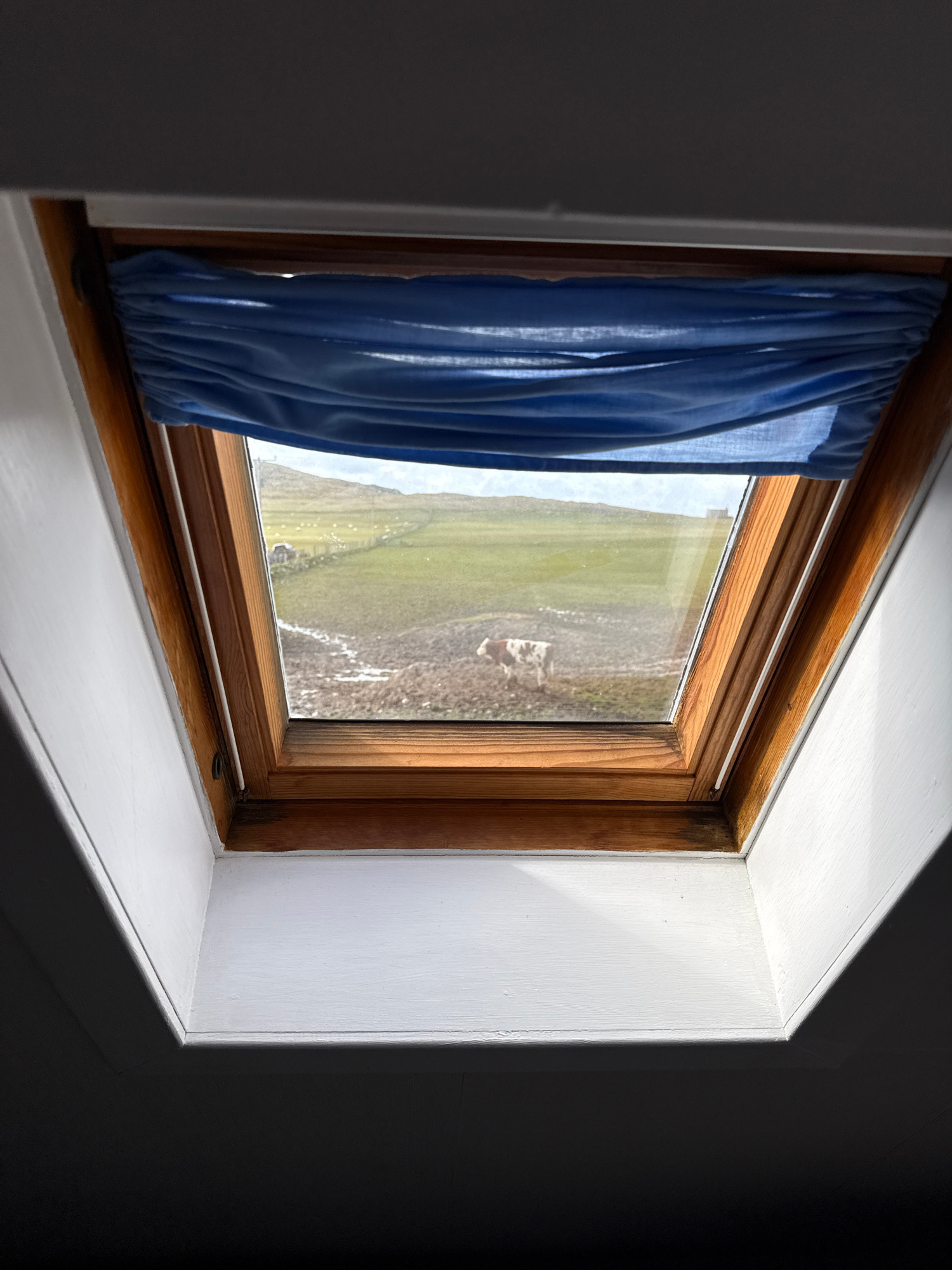 A wood-framed window, slightly open with a blue curtain partially covering the left side, is set into a white painted wall. The window offers a view of a green and brown landscape. The right side of t…read more