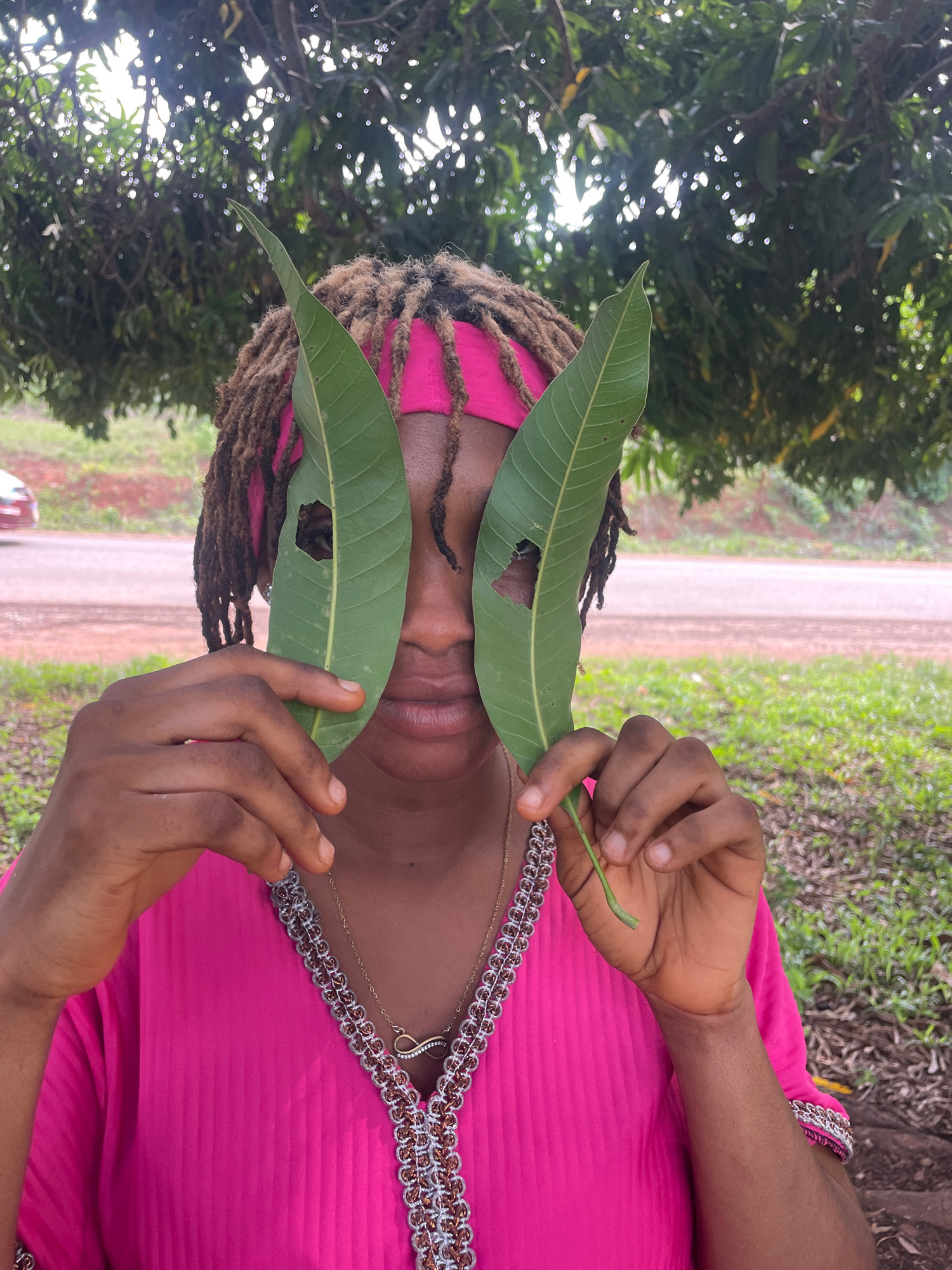 This vertical, close-up shot captures a person of color, likely in Ogbe, Nigeria, engaged in a playful interaction with nature during daylight hours. The individual, sporting dreadlocks, is seen from…read more