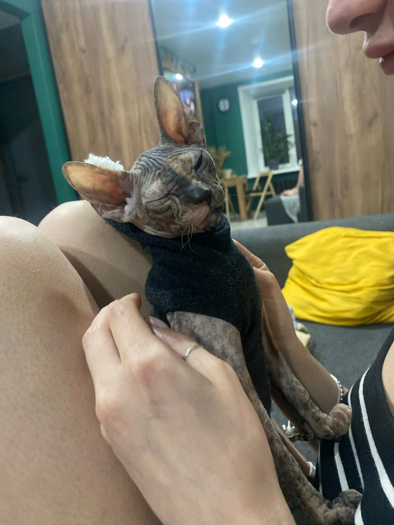 A tan, hairless cat is being held in a person's lap. The cat is wearing a black sweater and has its eyes closed. The person is wearing a black and white striped shirt and a silver ring. In the backgro…read more