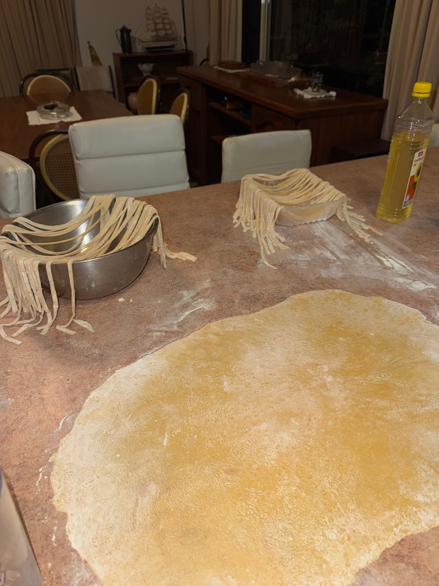 The image depicts a large sheet of pasta dough dusted with flour on a brown countertop. Cut noodles are seen arranged in two separate piles, one beside a metal bowl. A bottle of cooking oil is presentβ¦read more
