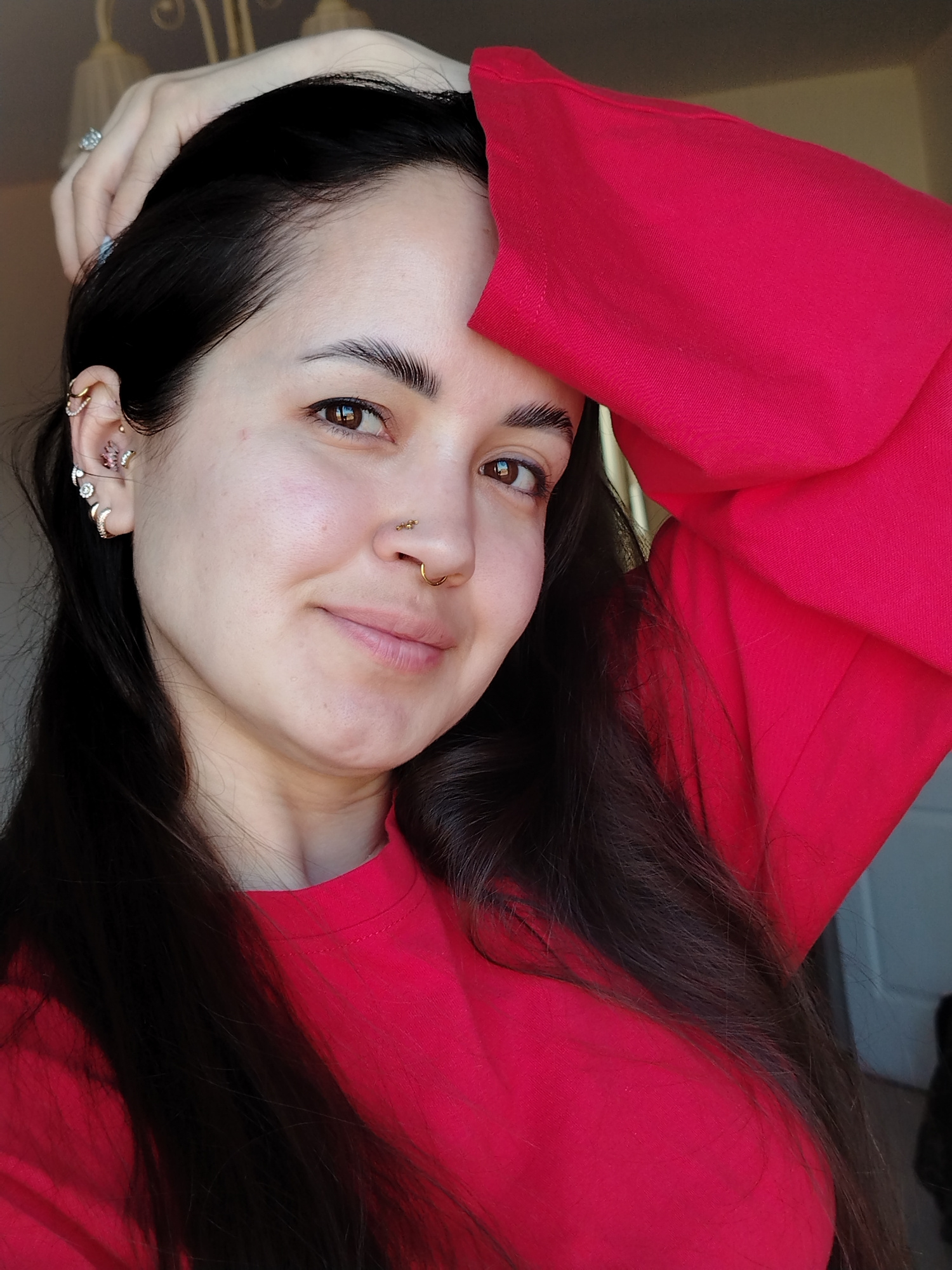 A close-up, brightly lit portrait captures a young woman looking directly at the camera with a gentle smile. She has long, dark brown hair, which she holds back with her left hand placed on top of her…read more