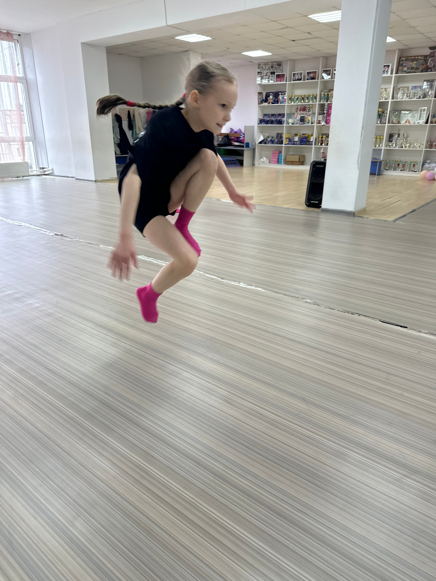 A young girl is captured mid-action indoors, likely performing a gymnastic, dance, or acrobatic move. She has light brown hair styled in two braids, wears a black short-sleeved top, black shorts, and…read more