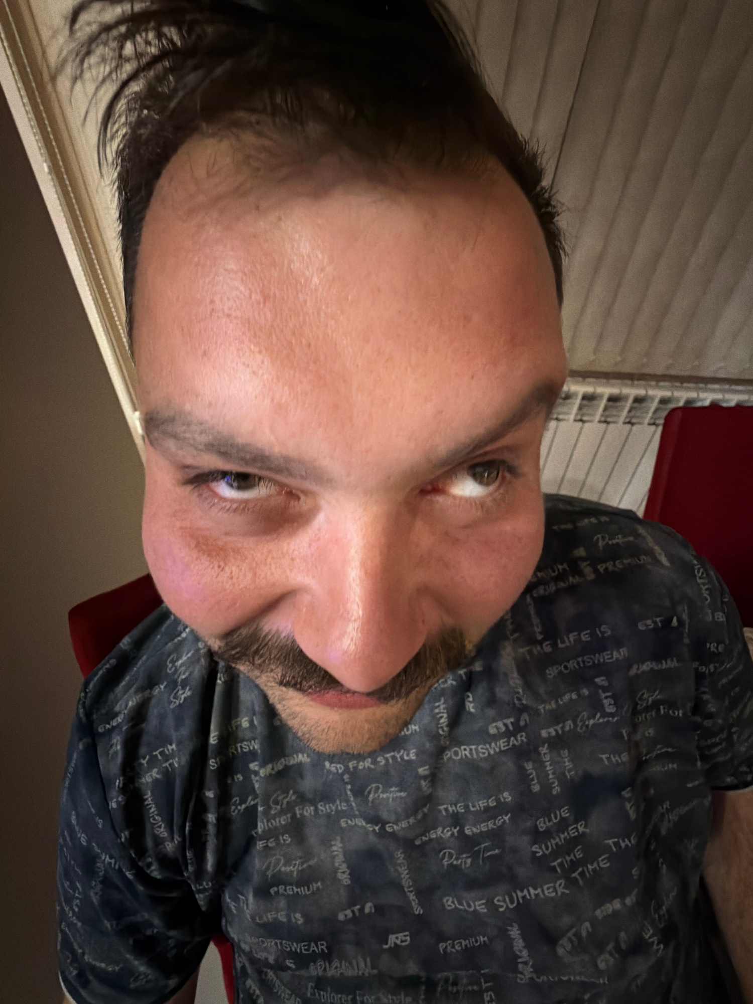 A close-up portrait of a middle-aged man with dark hair and a mustache, wearing a shirt with text printed on it. The location in Sandanski, Bulgaria is not identifiable from the image.