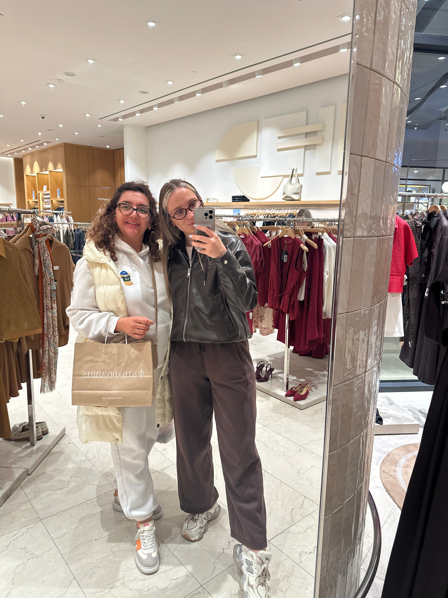 Two women are taking a selfie in a mirror inside what appears to be a clothing store. The location is inferred to be in Esenyurt, Turkey, based on the provided prompt. One woman has brown, curly hairβ¦read more