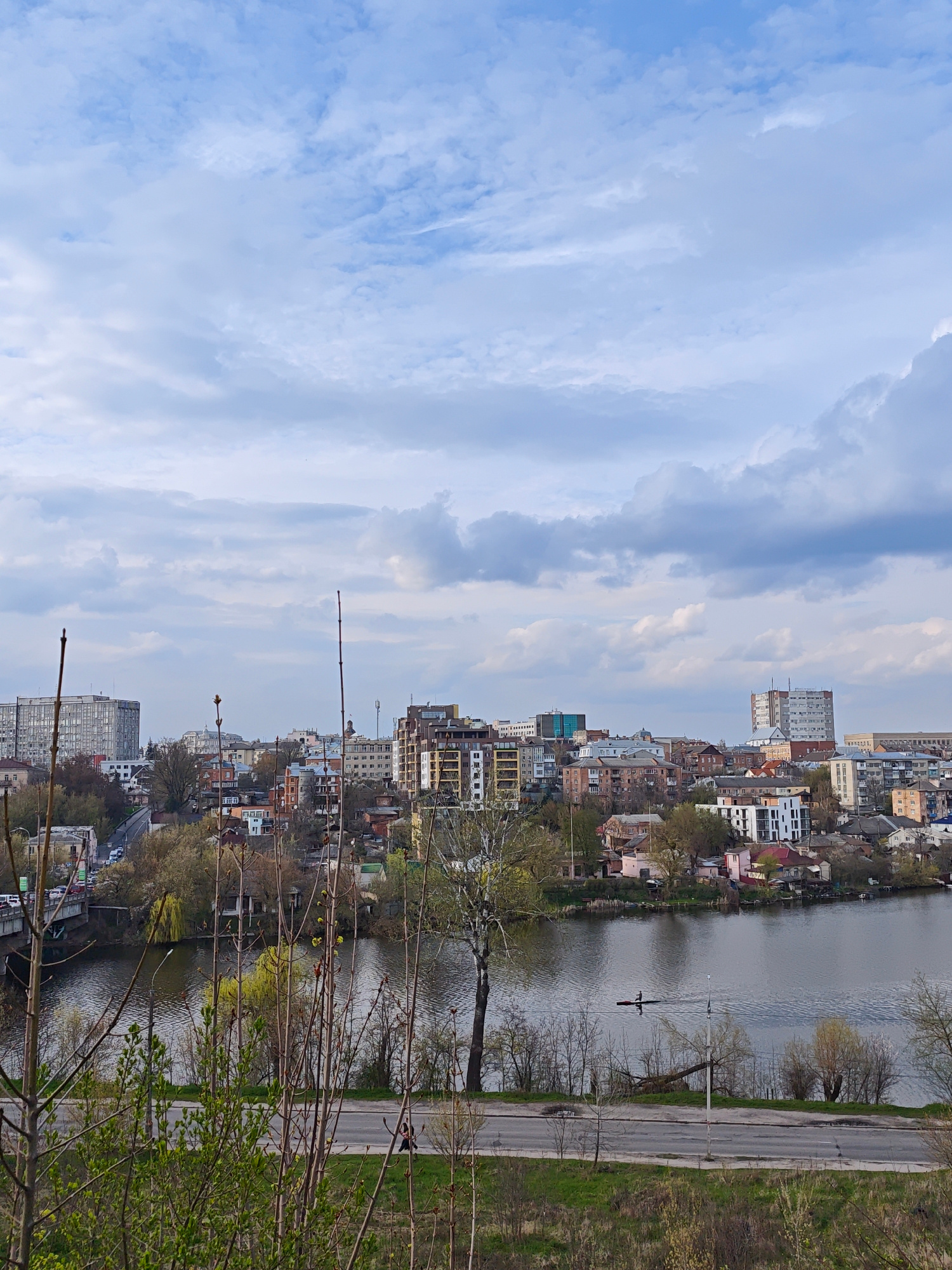 This panoramic image presents a daytime view of Vinnytsia, Ukraine, under a cloudy sky. The perspective is from an elevated vantage point, looking across a river towards the city. In the immediate fo…read more