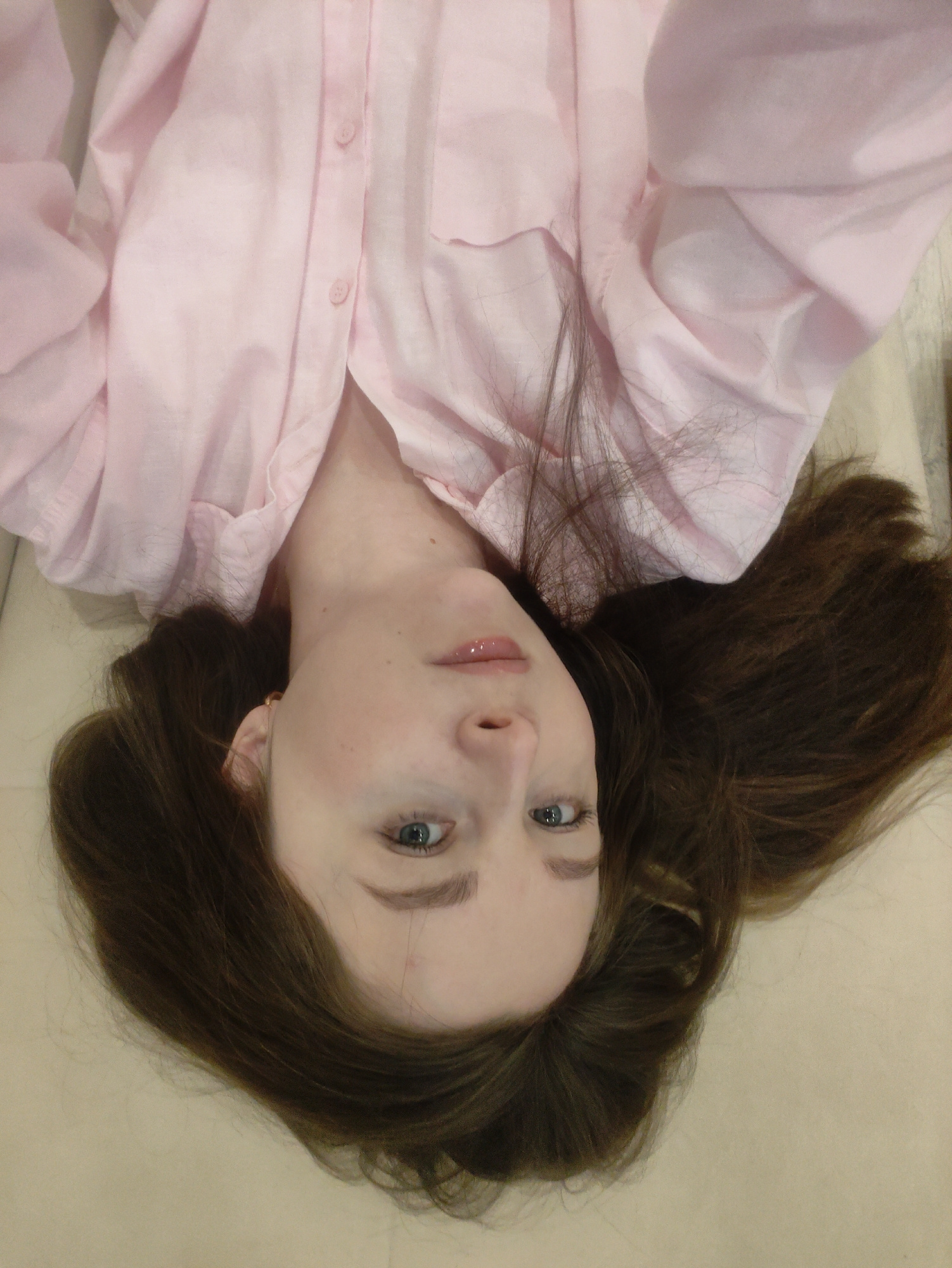 A woman with long, brown hair and blue eyes is lying down, facing upwards. She is wearing a light pink button-down shirt. The background appears to be a light-colored surface, possibly a floor or bed.…read more