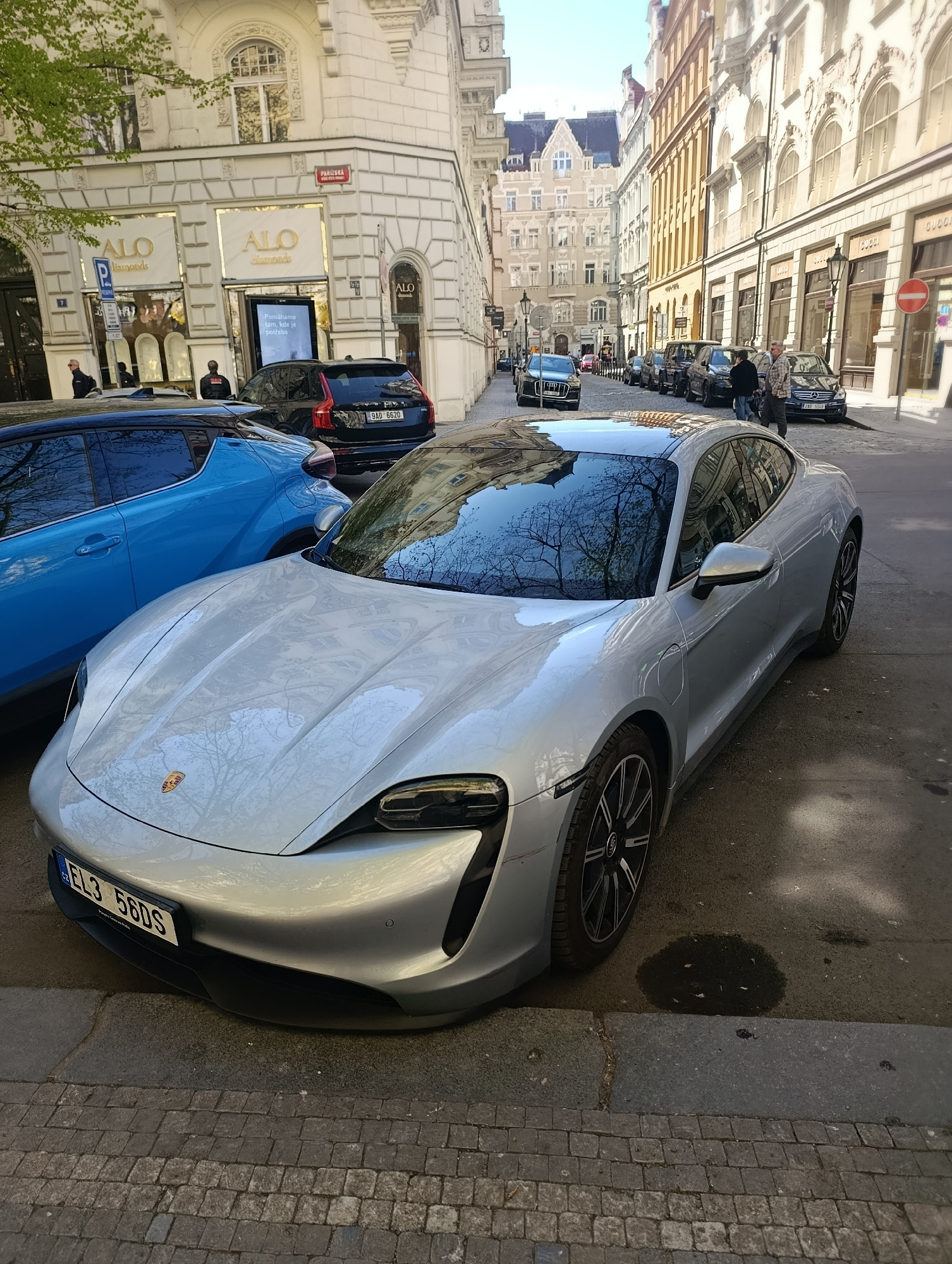 The image shows a silver Porsche Taycan parked on the side of a street in Prague, Czechia. Next to the Porsche is a blue car. Behind the blue car is a black Volvo with the license plate "9AD 6620". In…read more