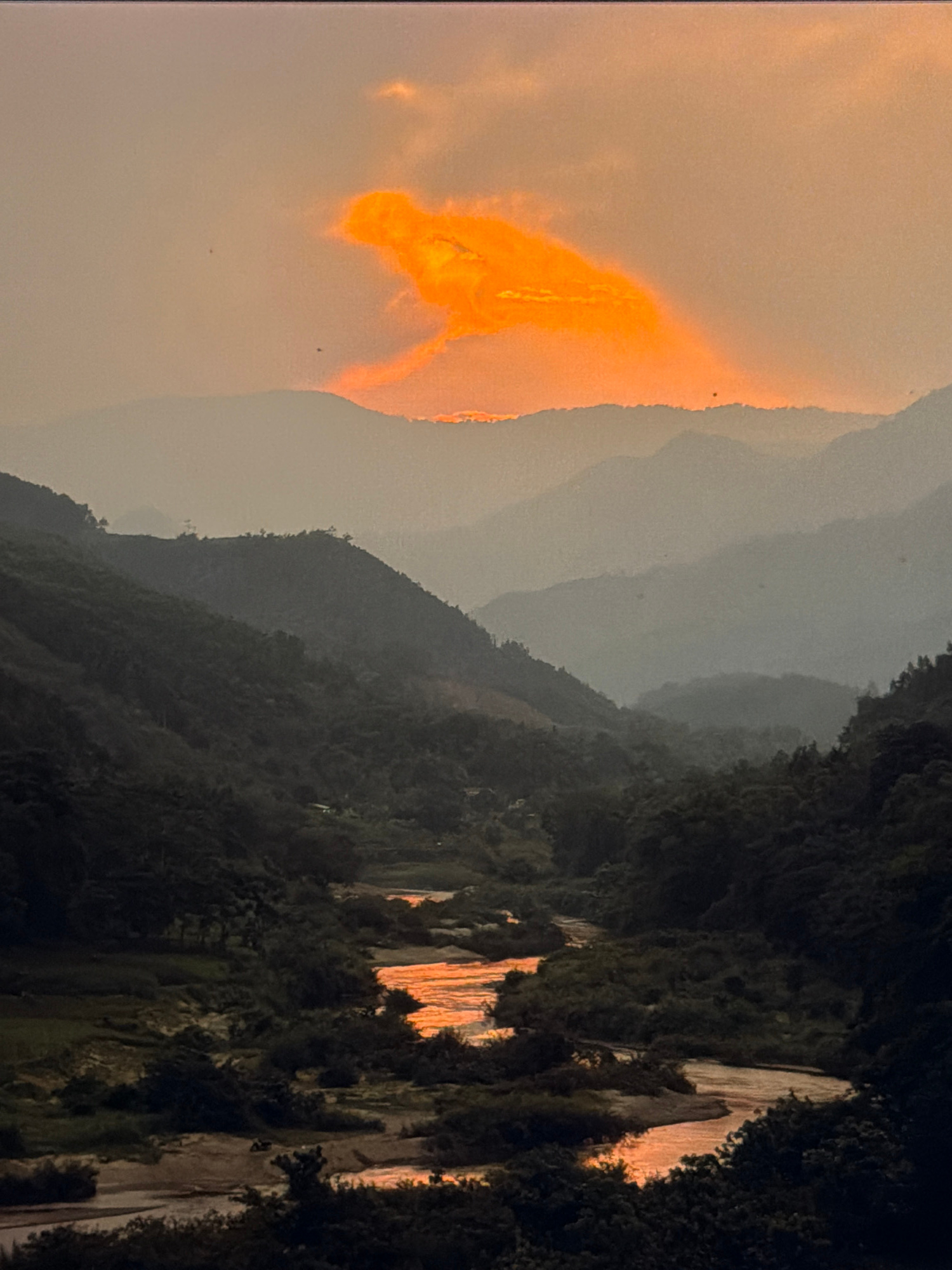 A landscape photograph shows mountains in a hazy scene at sunset, with an orange-colored sky on the left. The mountains fade into the background, becoming lighter in color. On the right, a dark cliff…read more