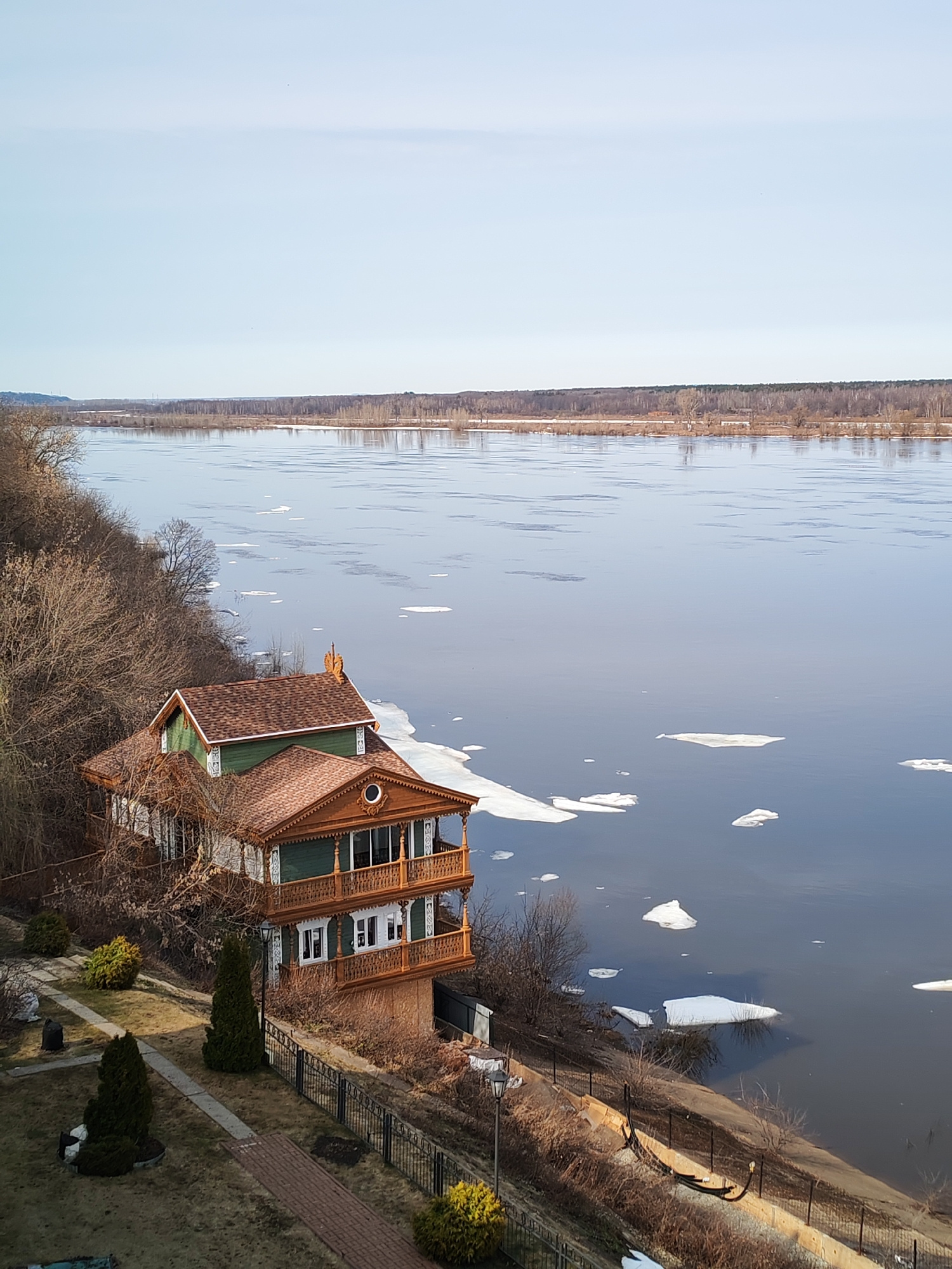 The image shows a two-story wooden house situated on a slope overlooking the Kama River in Sarapul, Russia. The river is partially covered with ice floes. The house is surrounded by trees and a landsc…read more