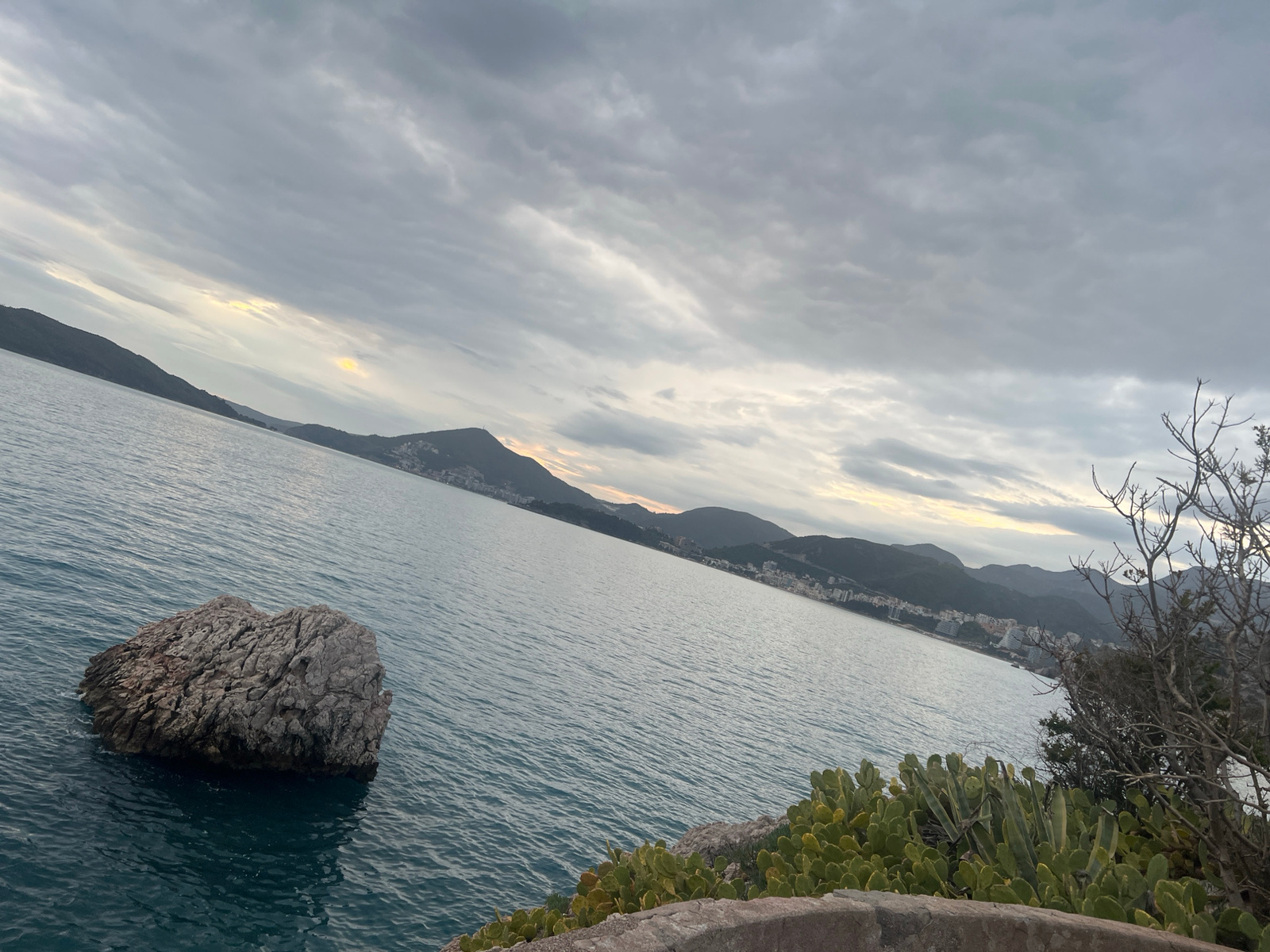 The image depicts a coastal scene in Boreti, Montenegro, under an overcast sky. A large rock formation sits in the foreground of the water. Behind it, the coastline curves with mountains and buildings…read more