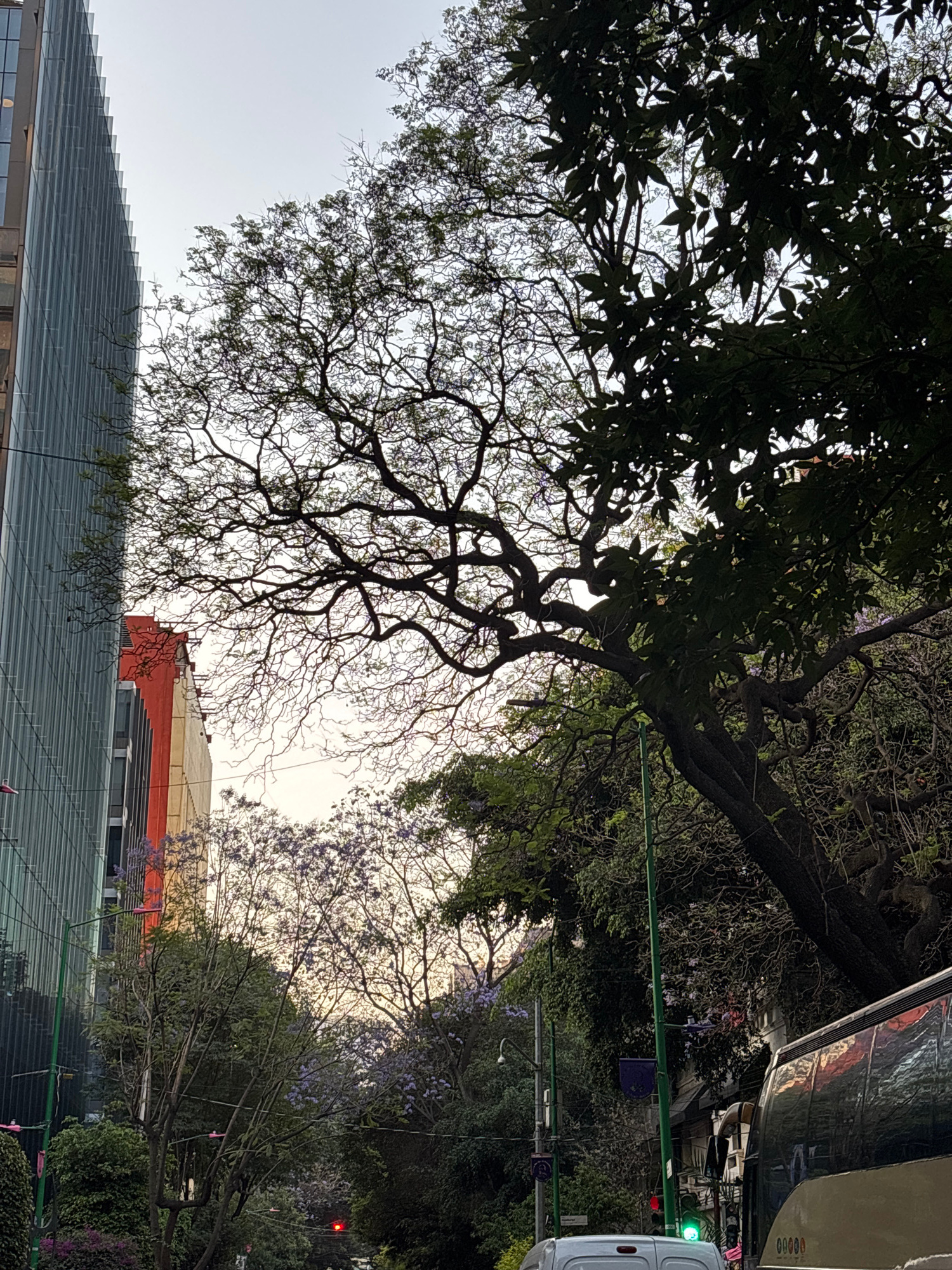 The image, taken in Mexico City, presents an urban street scene dominated by large trees and modern architecture, viewed from a slightly upward angle. A prominent, mature tree with a complex network o…read more