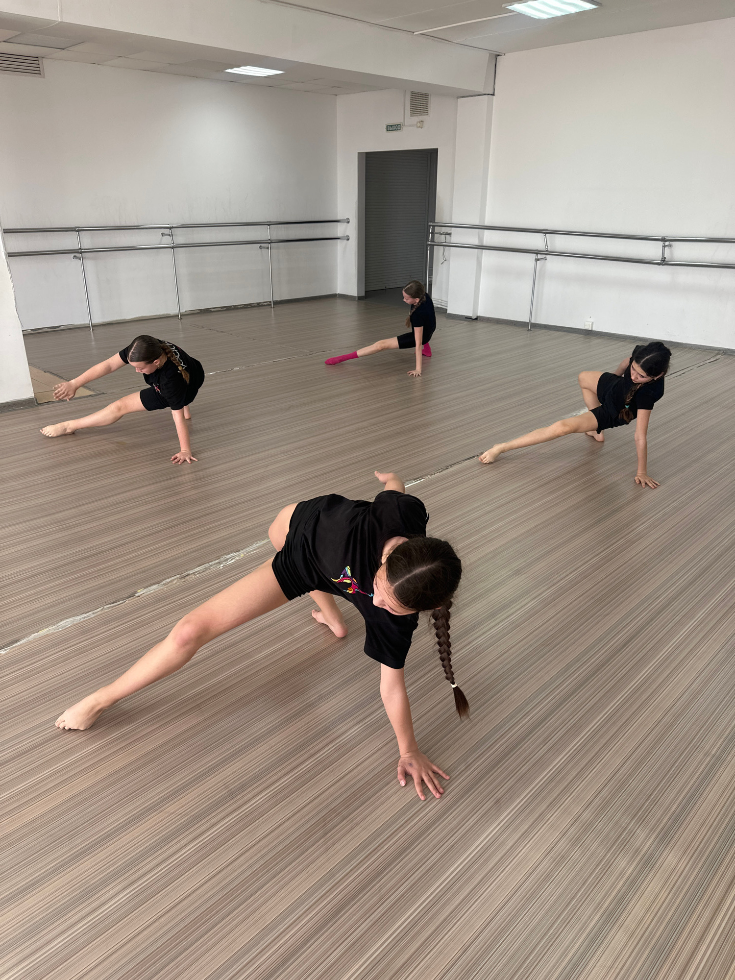 The image shows a dance studio in Votkinsk, Russia. Four young women in black t-shirts and black shorts are practicing a modern dance routine. They are barefoot, and their bodies are positioned in var…read more
