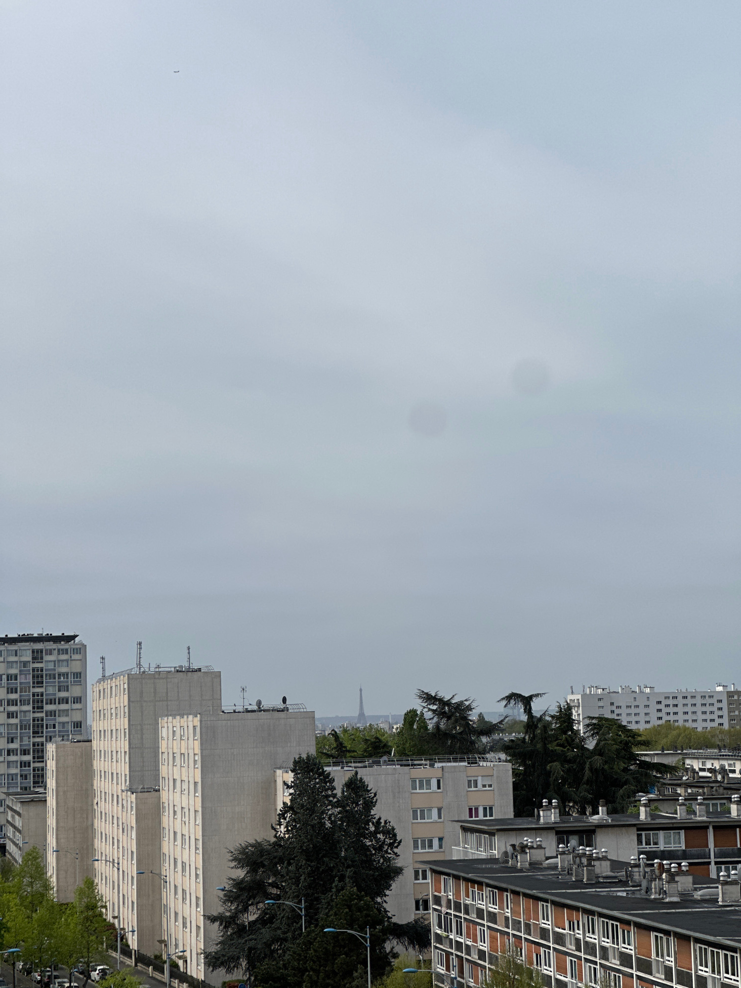 The image shows an overcast urban landscape in Sarcelles, France. A tall building with many windows dominates the foreground. Other buildings of varying heights and architectural styles line the right…read more