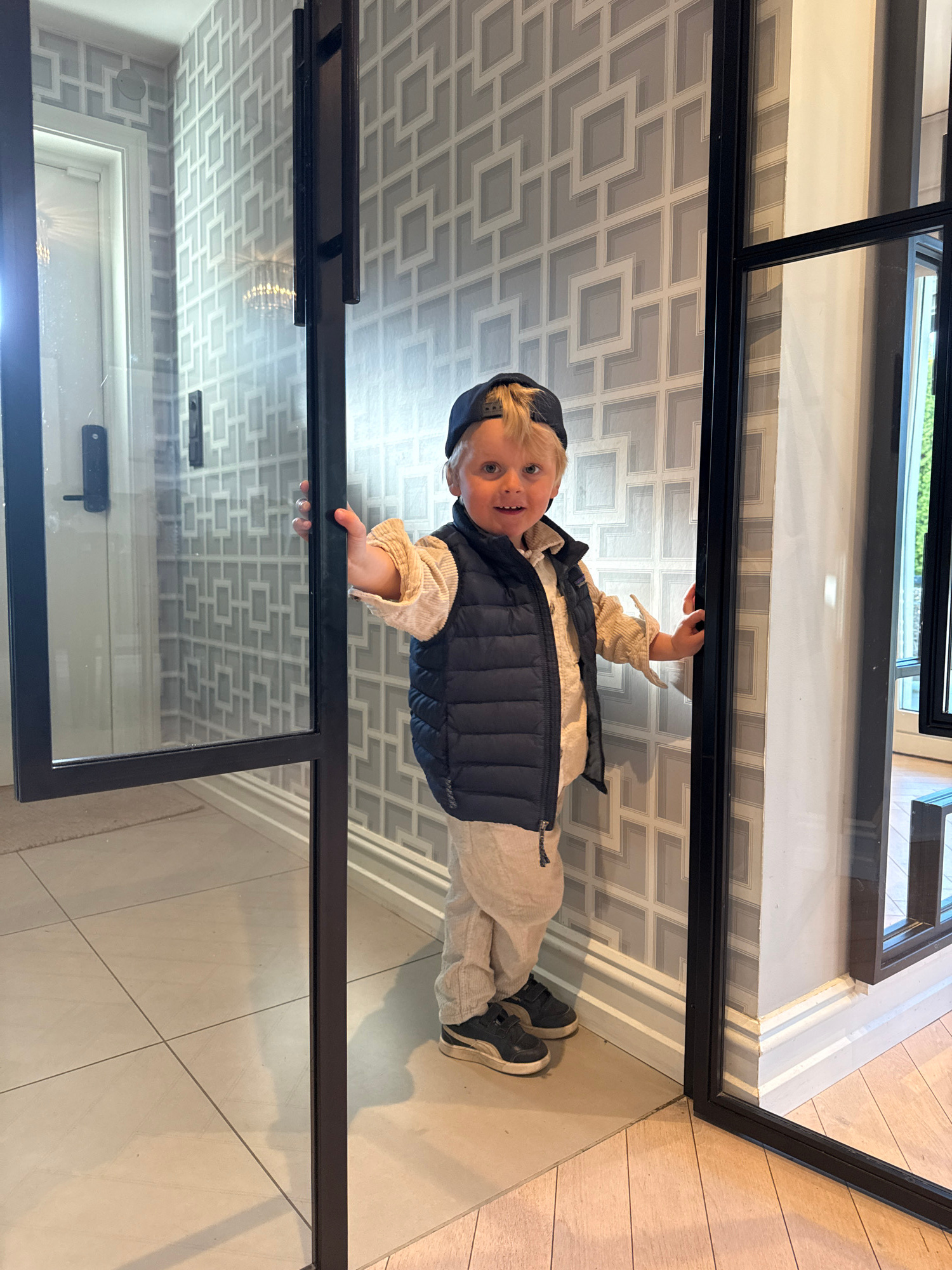 A young child wearing a dark-colored cap, beige corduroy-like pants and jacket, and a dark puffer vest stands facing the camera. The child is holding onto the frame of a glass door or partition. The b…read more